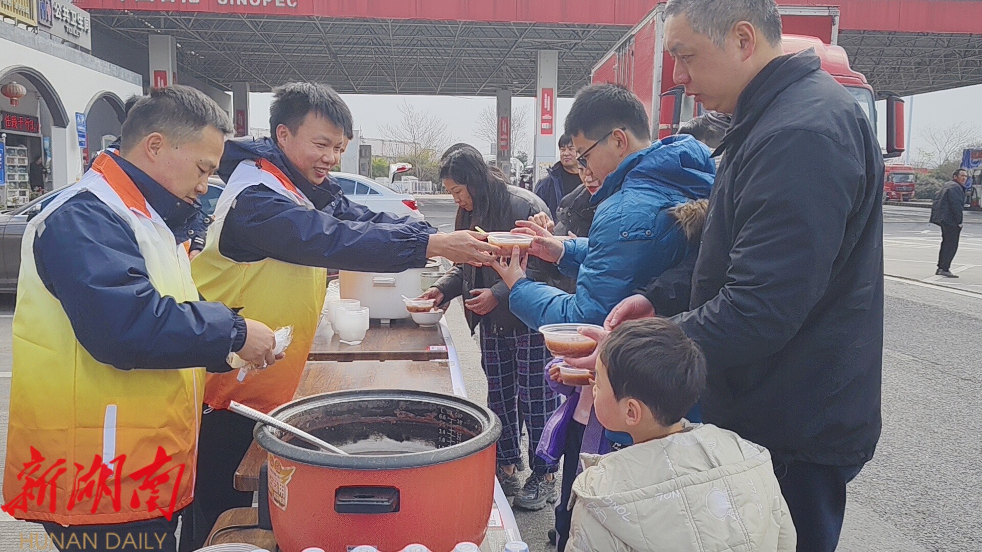湖南日报·新湖南客户端1月26日讯(通讯员 罗艳奇 谷文婷 )在腊八节来临之际,湖南高速集团郴州分公司永兴收费站联合郴州北管理所,在G4京港澳永兴服务区开展了以“腊八粥香迎新岁·盛世中华庆大年”为主题的第九届腊八节赠粥活动,为过往司乘送上冬日里的温暖与新春祝福。