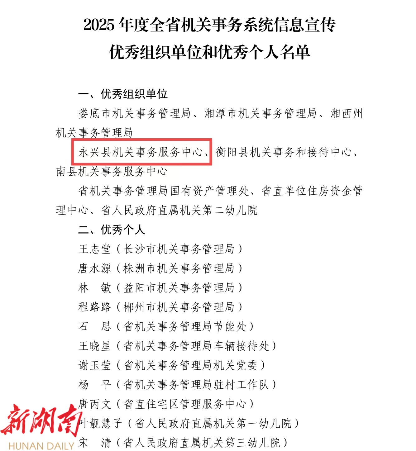 湖南日报·新湖南客户端1月27日讯(通讯员 黄波 温艳芳 李琼花 )近日,湖南省机关事务管理局办公室印发了《湖南省机关事务管理局关于对2025年度政务信息宣传优秀组织和优秀个人予以表扬的通报》,永兴县机关事务服务中心凭借扎实有效的工作举措、高质量的信息宣传成果,获评2025年度全省机关事务系统信息宣传优秀组织单位。