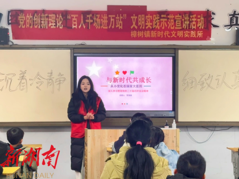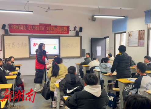 湖南日报·新湖南客户端1月26日讯(通讯员 贺玉佳)“大家看,教室里的智慧黑板、家乡湘江边的美丽风光、我们喜欢的国潮动画,这些身边看得见的变化,正是党的二十届四中全会总结的‘十四五’成就的一部分,也是我们理解全会擘画的‘十五五’蓝图的最好入口……”1月26日,一堂别开生面的“发现”课在湘阴县樟树中学六年级开讲。活动现场,“小青椒”理论宣讲团成 员以《与新时代共成长:从小变化看国家大蓝图》为题,为孩子们带来了一场生动的党的二十届四中全会精神宣讲。