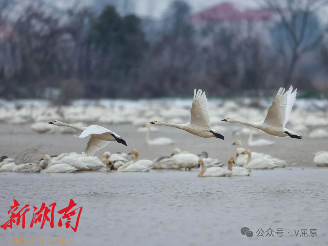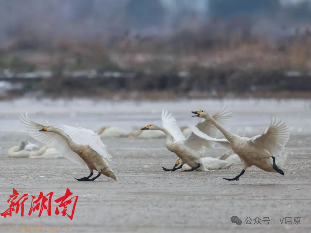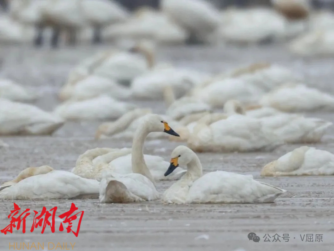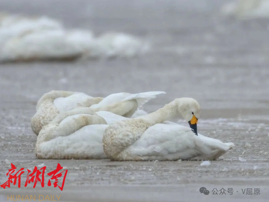 湖南日报·新湖南客户端1月27日讯(通讯员:梁静 周洋)上周的冰雪天气为冬日涂抹上凛冽而诗意的底色,人们在家中静享暖意之时,屈原管理区的东古湖湿地却热闹起来——成千上万只远道而来的西伯利亚小天鹅,正在冰湖之间嬉戏起舞,宛若闯入人间的童话。