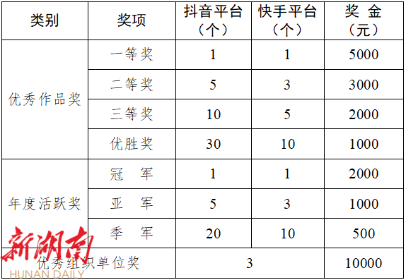 2.活动期间发布40条以上作品的账号,可参评年度活跃奖(已获得一二三等奖及优胜奖的不再参评此奖项)。具体规则如下:按照抖音平台、快手平台发布作品数量排名,前三名获评年度活跃冠军、亚军、季军。