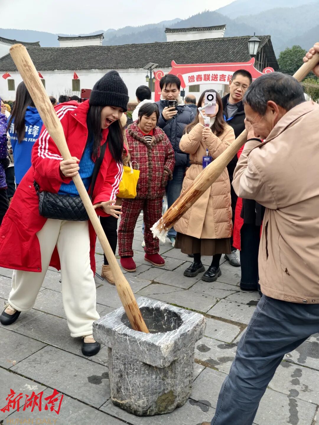 午后的活动亮点纷呈、趣味升级。14时30分,吉祥摸鱼、鸡鸭趣抓环节正式拉开帷幕,徒手摸鱼、趣味捕禽的互动体验,吸引大人小孩齐上阵,欢呼声、笑语声回荡在庭院田间,暖意融融。持续至17时30分的年味民俗集市堪称全场“人气王”,竹编工艺、捏糖人、打糍粑等非遗技艺与传统美食现场展演,游客们亲手参与磨豆腐、制作糖葫芦,指尖流转间感受传统年味;滚铁环、打陀螺、踢毽子等怀旧游戏唤醒集体记忆,怀素、柳宗元、关羽等零陵特色NPC穿梭巡游,古今交融的独特场景让市民游客流连忘返。此外,“零陵村播”现场开启直播带货,将零陵特色农副产品推向更广阔的市场,实现文旅与消费的深度联动。
