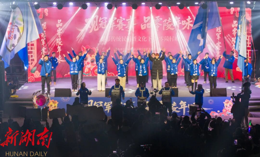 湘超冠军永州队主力前锋、零陵文旅推荐官林昊,特意回到家乡富家桥镇登上村晚舞台,为家乡倾情“代言”:“我们零陵景点多、美食多,年味足、人情暖,欢迎全国人民来零陵做客游玩!”真挚的话语赢得全场阵阵掌声。随后,林昊与现场球迷代表亲切互动,共同唱响永州队助威歌曲《赤血忠诚》(永州版),激昂的旋律、滚烫的歌词点燃全场热血,将村晚互动热情推向小高潮。