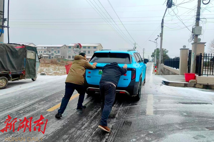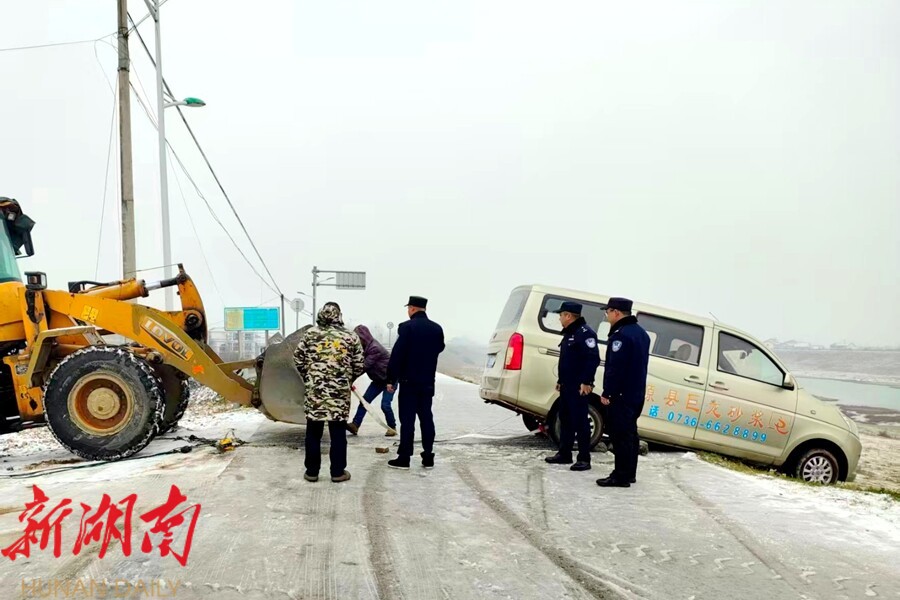临危处置,火速救援。 今日上午9时30分许,乡抢险队在S311白洋河桥头路段作业时,发现一辆面包车失控侧滑至路基下。队员立即展开救援,通过清理积雪、铺设防滑料、利用拖车绳牵引等方式,历时约50分钟,成功将车辆拖回安全区域。被困人员经检查未受伤,并获保暖衣物、热水等照料。中午12点30分许,另一组巡查人员在乡道白洋河路段巡逻时,发现一辆小轿车因路面结冰打滑悬停在陡坡中。巡查人员立即停车施救,由专人下车指挥,其余人员合力推车,仅用5分钟便帮助车辆平稳起步。