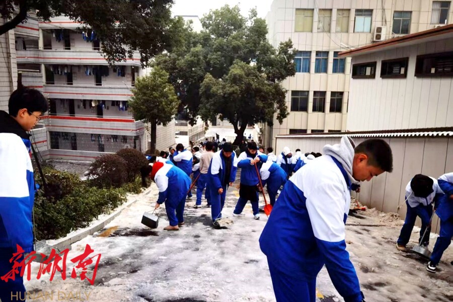 视外桃源客户端1月21日讯(通讯员:张丽玲)“高三教学楼走廊湿滑”,“办公楼前台阶结冰”,“主干道坡路车辆易打滑” ,桃源二中学校工作群里不断闪烁着风雪天气安全隐患的信息,学校主要负责人紧盯着工作群,镇定自如的发布指令,开启了一场与风雪搏斗的安全保卫战。