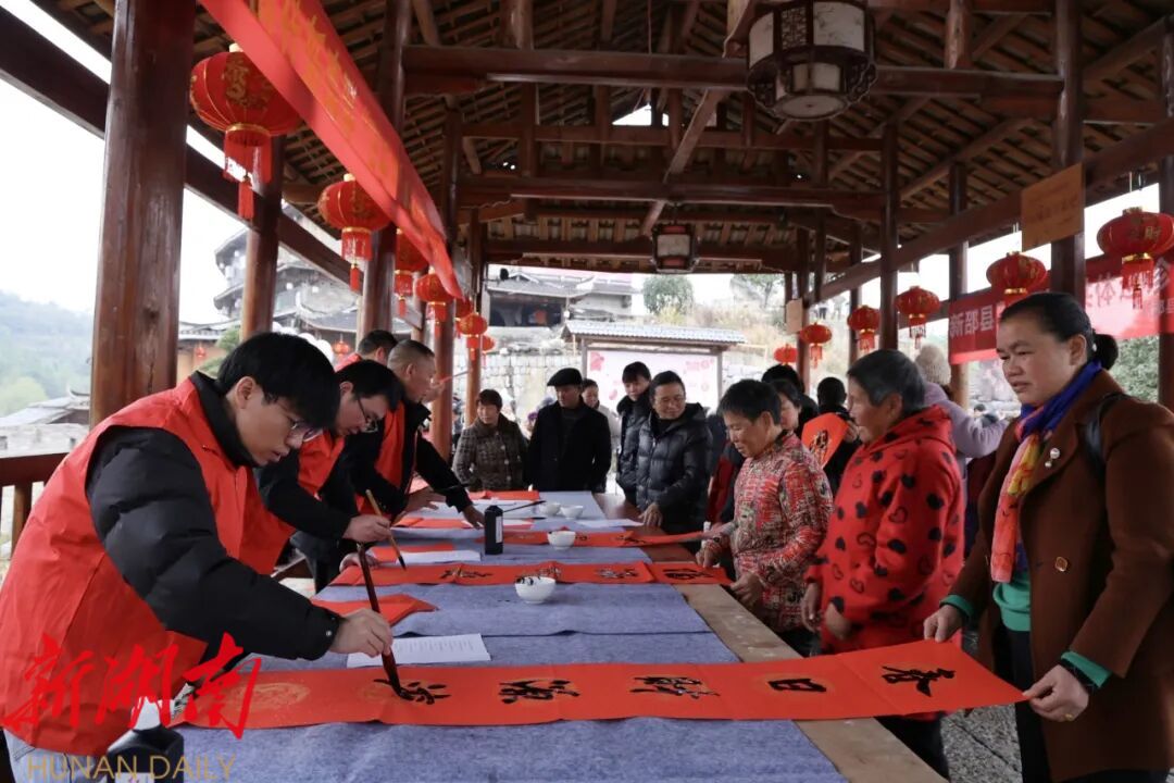 活动现场年味十足。书法家们凝神挥毫,将新春祝福凝于笔端,一副副笔力遒劲、寓意吉祥的春联刚落墨,便被村民们争相领走。打糍粑、杀年猪、熬腊八粥等民俗体验区前,村民们踊跃参与,木槌起落间糯饭飘香,铁锅蒸腾中暖意流淌,响亮的号子声里满是丰收的喜悦与对新年的期盼。志愿者们将一碗碗腊八粥、一个个小糍粑送到“三老”人员手中,大家围坐一起,话家常、聊收成,场面温馨和谐。与此同时,义诊义剪、垃圾分类宣传等便民服务与文明倡导活动同步开展,把贴心关怀送到群众身边。