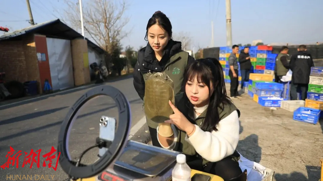 记者看到,来自汉寿县君惠水产有限公司 的 工作人员在起鱼现场通过网络直播镜头与网友、商户无缝对接,宣传推介优质的汉寿甲鱼,甲鱼从塘里捕获后客户通过现场直播平台,拍照下单,实现即卖即打包,从基地直达客户手中。