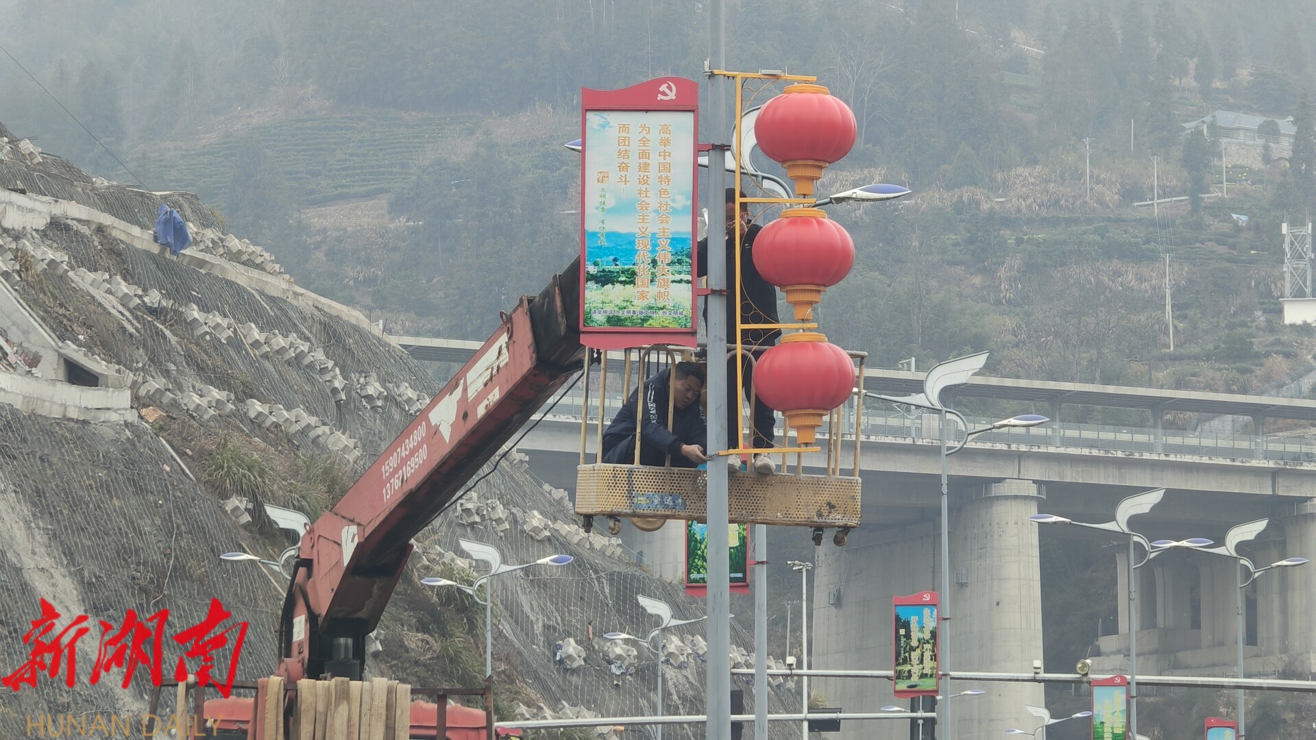 新湖南客户端1月28日讯(通讯员 杨昊天)春节临近,湘西土家族苗族自治州古丈县城区街头年味渐浓。1月27日,县城主要路段春节氛围布置工作正式启动,工人们正紧锣密鼓地为城市换上新装。