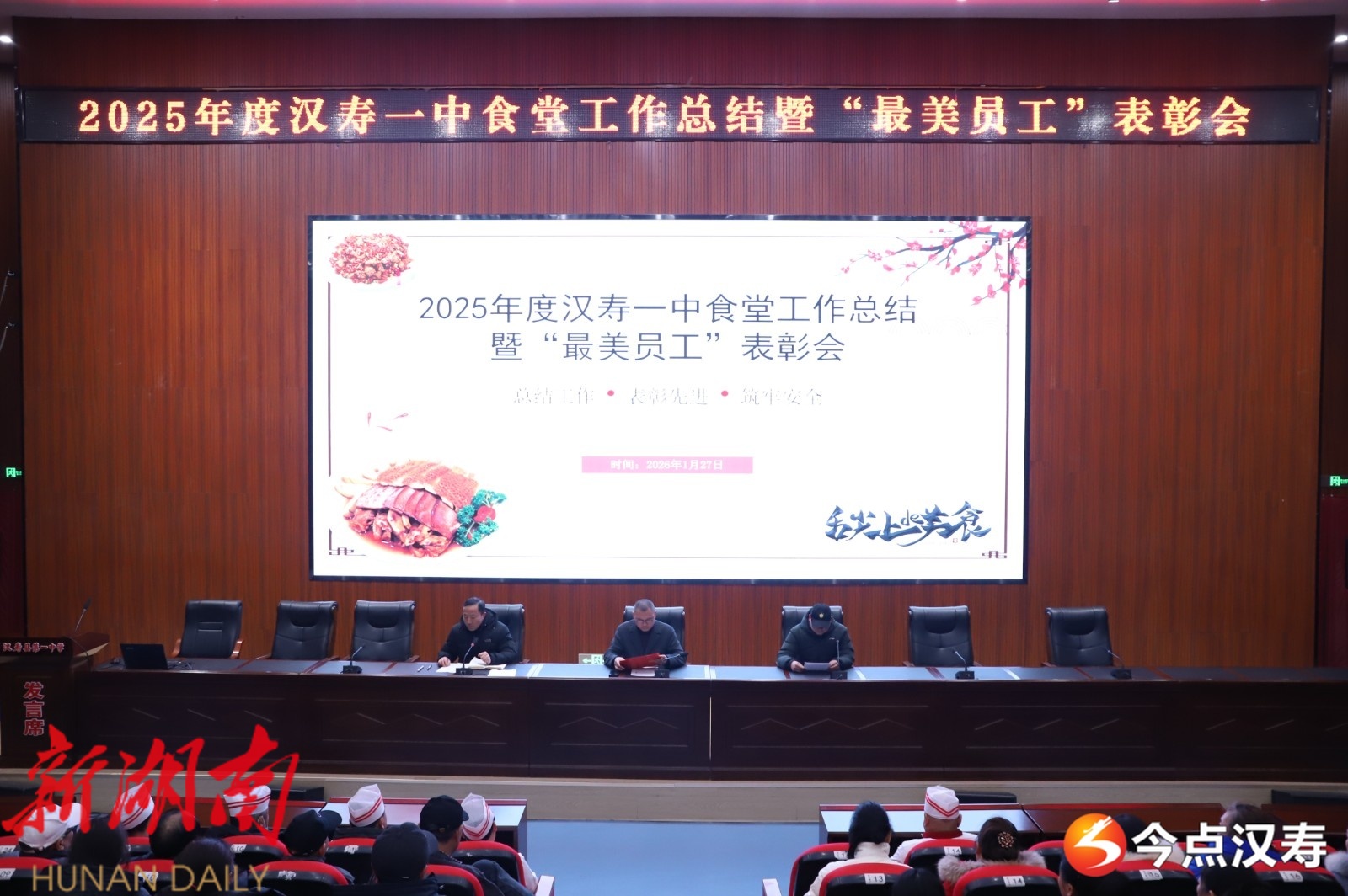汉寿融媒1月28日讯(通讯员:陈雨欣)1月27日晚,汉寿一中召开食堂年度工作总结暨表彰会议。学校班子成员、膳食处负责人及全体食堂员工参加了会议。