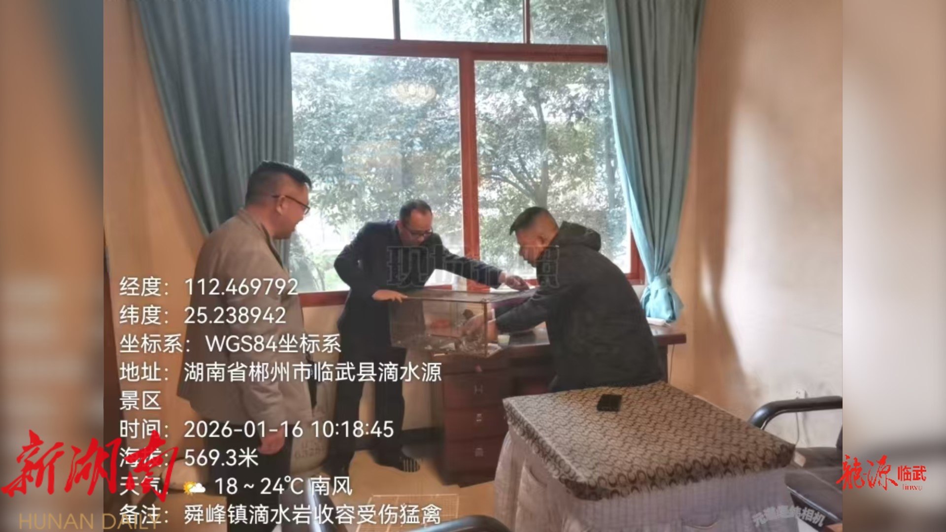 1月16日下午,临武县林业局工作人员接到滴水源景区工作人员的求助电话,称景区内发现一只疑似国家级保护动物的鸟类,无法正常飞行,急需专业救助。