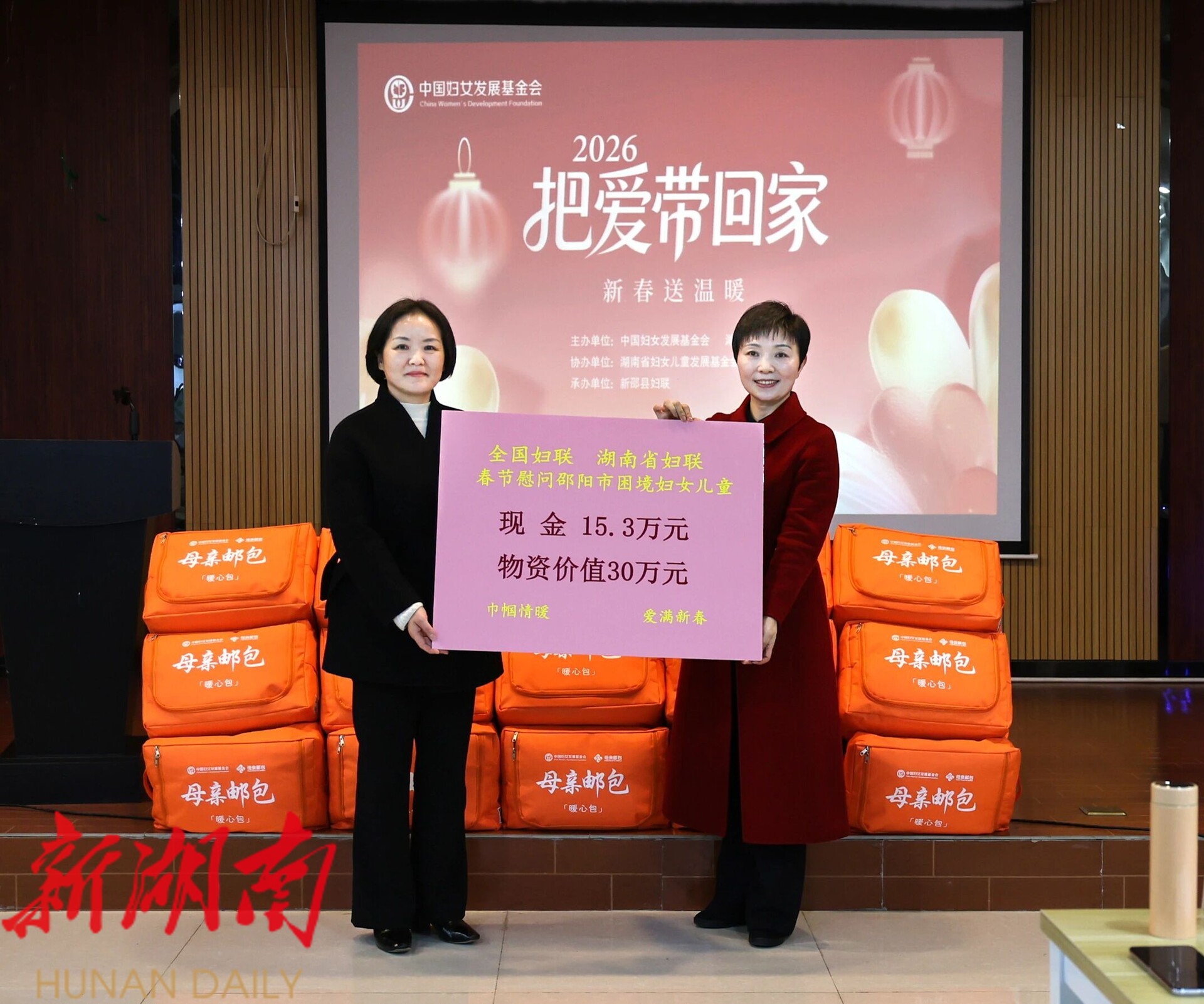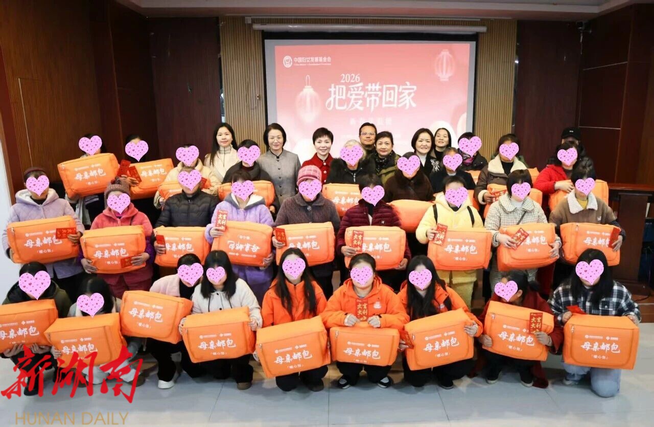 在新邵县村播妇联基地举行的2026把爱带回家·“母亲邮包”集中发放仪式上,杨成英现场向困境妇女捐赠“母亲邮包”和发放慰问金,并代表省妇联为邵阳市困境妇女儿童捐赠15.3万元现金和价值30万元的爱心物资。