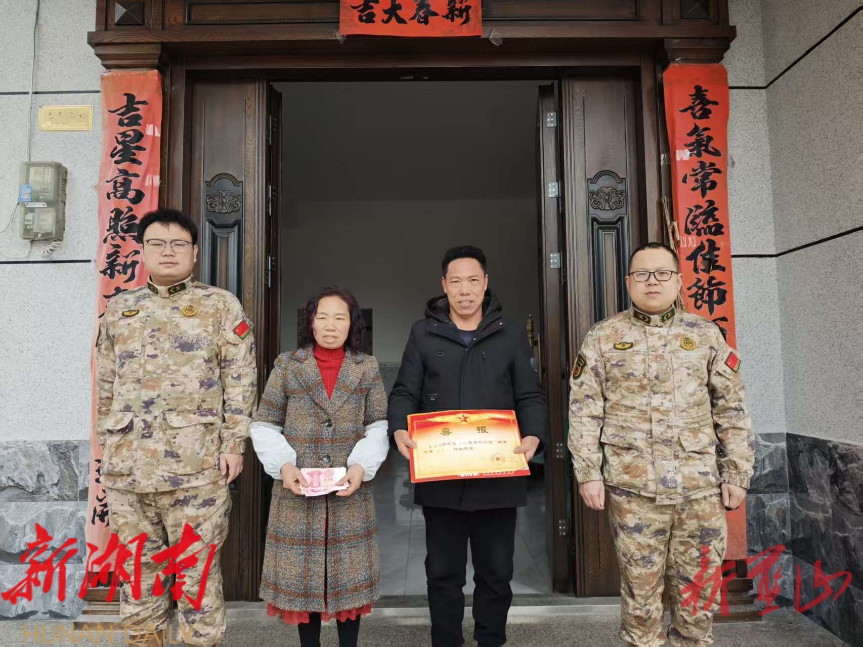 新蓝山客户端1月29日讯 (通讯员 周璞)1月28日,祠堂圩镇武装部联合镇退役军人服务站,为军属送上“四有”优秀士兵喜报与慰问金,把党和政府的温暖送到军属心坎上。