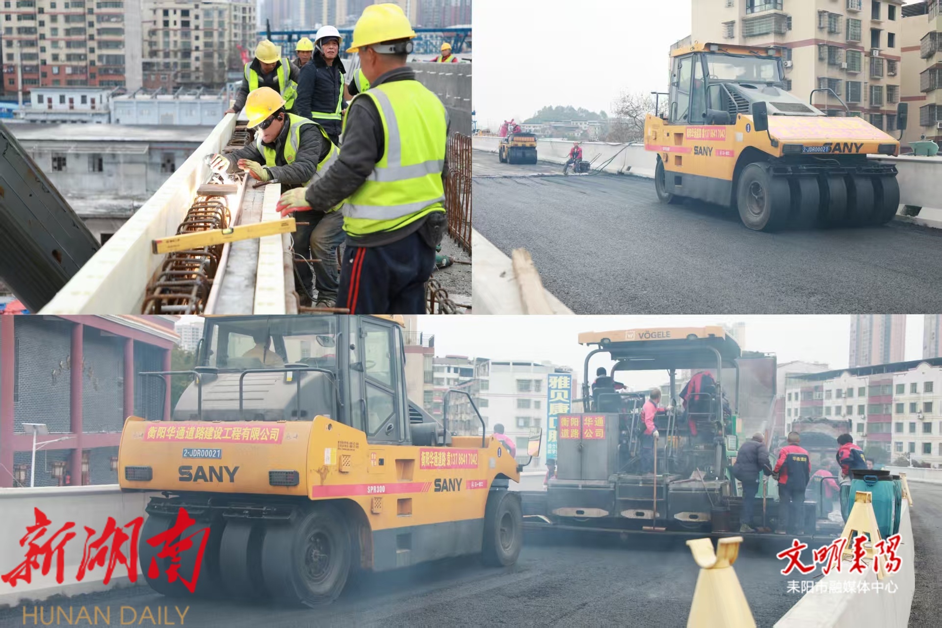 武园路上跨京广铁路立交桥项目现场,数台压路机、摊铺机正来回铺设路面沥青,工作人员加班加点赶进度,全力冲刺工程扫尾工作。