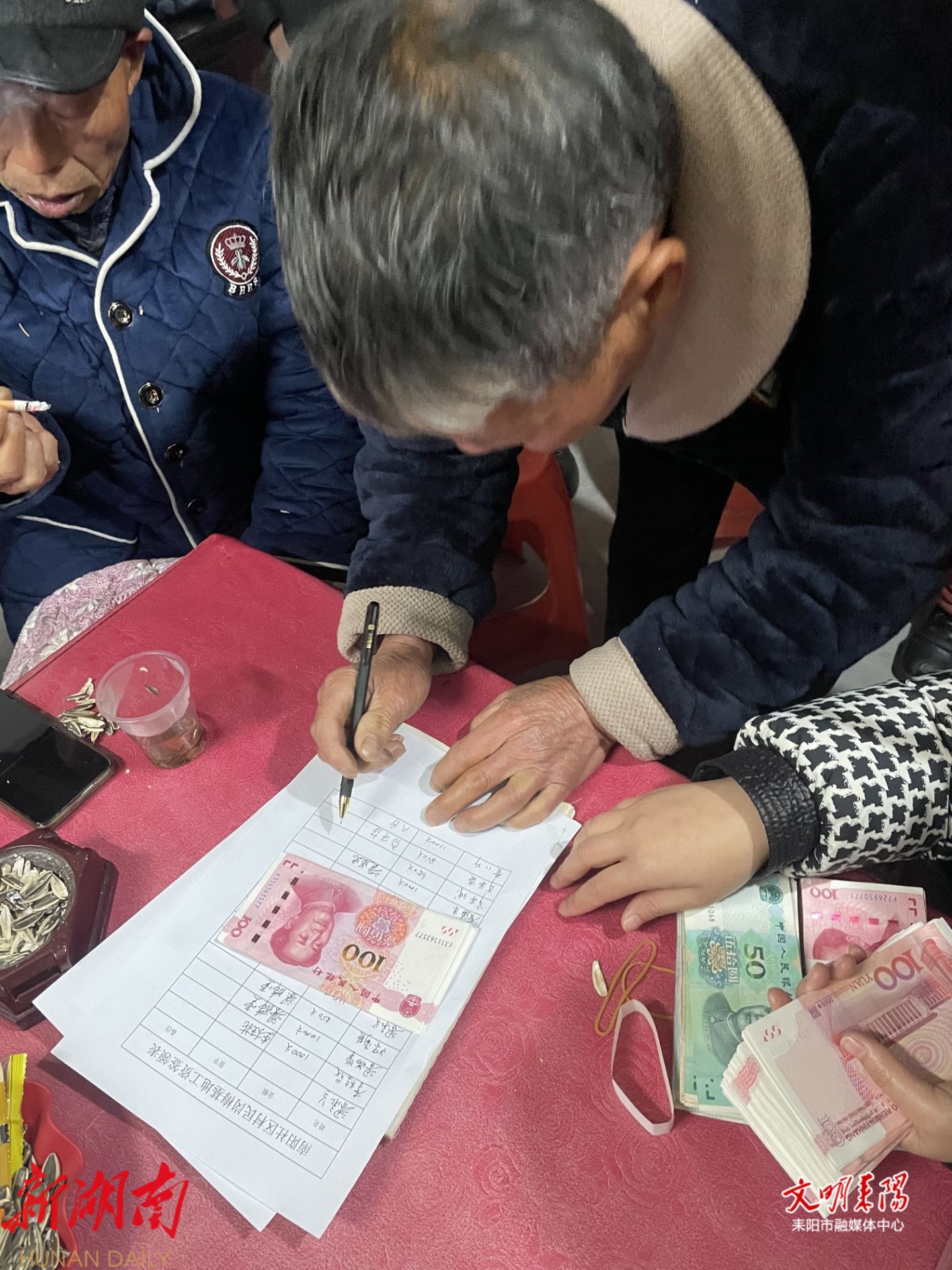 耒阳融媒1月26日讯(记者 杨明涛 通讯员 黄荣) 今天是腊八节,过了腊八就是年。在南阳镇金星村便民服务大厅内,40余名村民排起整齐的队伍,脸上漾着藏不住的喜悦,依次领取在本村千亩岗梅药材基地务工的“年终薪金”。一沓沓崭新的百元现金在掌心传递,不仅驱散了零度寒冬的凛冽,更点燃了乡亲们增收致富的热切期盼,让这个冬日因“薪”而暖、因“心”而热。
