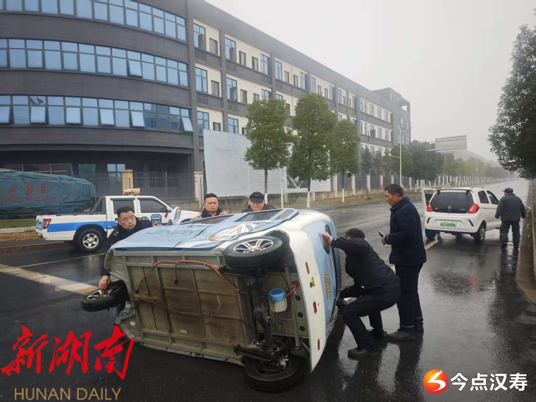 城管队员们分工协作,一边做好现场安全警示,疏导路面来往车辆,一边合力将侧翻的三轮电动车扶正,仔细查看车辆受损及人员受伤情况。