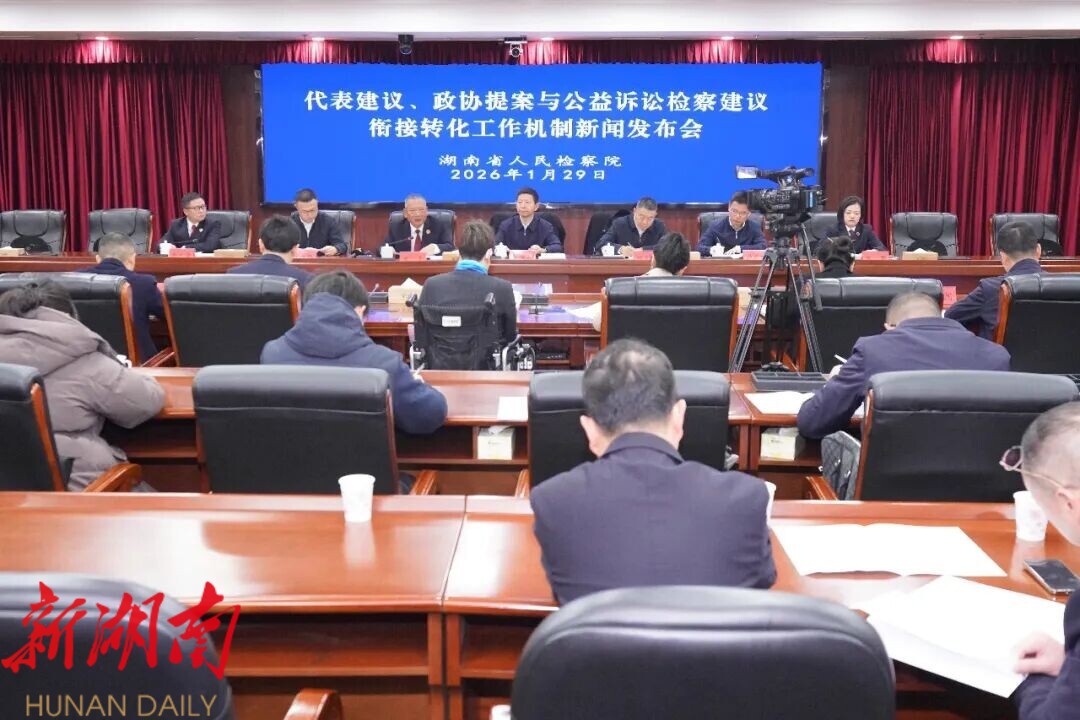 新湖南客户端1月29日讯(通讯员 杨叶芳)1月29日,湖南省人民检察院召开新闻发布会,通报开展代表建议、政协提案与公益诉讼检察建议衔接转化工作(以下简称“双向衔接转化”)的最新进展。省人大监察和司法委员会副主任委员王洪斌,省政协委员、社会和法制委员会驻会副主任杨天兵出席新闻发布会并答记者问。