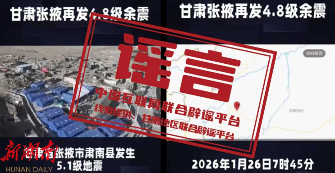 详情: 近期,网上流传“2026年1月26日7时45分甘肃省张掖市肃南县发生5.1级地震”“甘肃张掖再发4.8级余震”等消息,引发关注。经核实,网传视频中所显示震中地理位置位于新疆喀什、和田地区,所呈现的季节特征也与甘肃省张掖市本季节景色不符。截至当前,中国地震台网中心未查询到张掖市辖区当日发生地震的相关记录,张掖市地震局、张掖地震监测中心站未监测到任何可能引发破坏性地震的前兆异常信号,也未发布任何地震预警、预报信息。网传内容不实。(来源:“甘肃网络举报”微信公众号、张掖市融媒体中心、张掖市地震局)