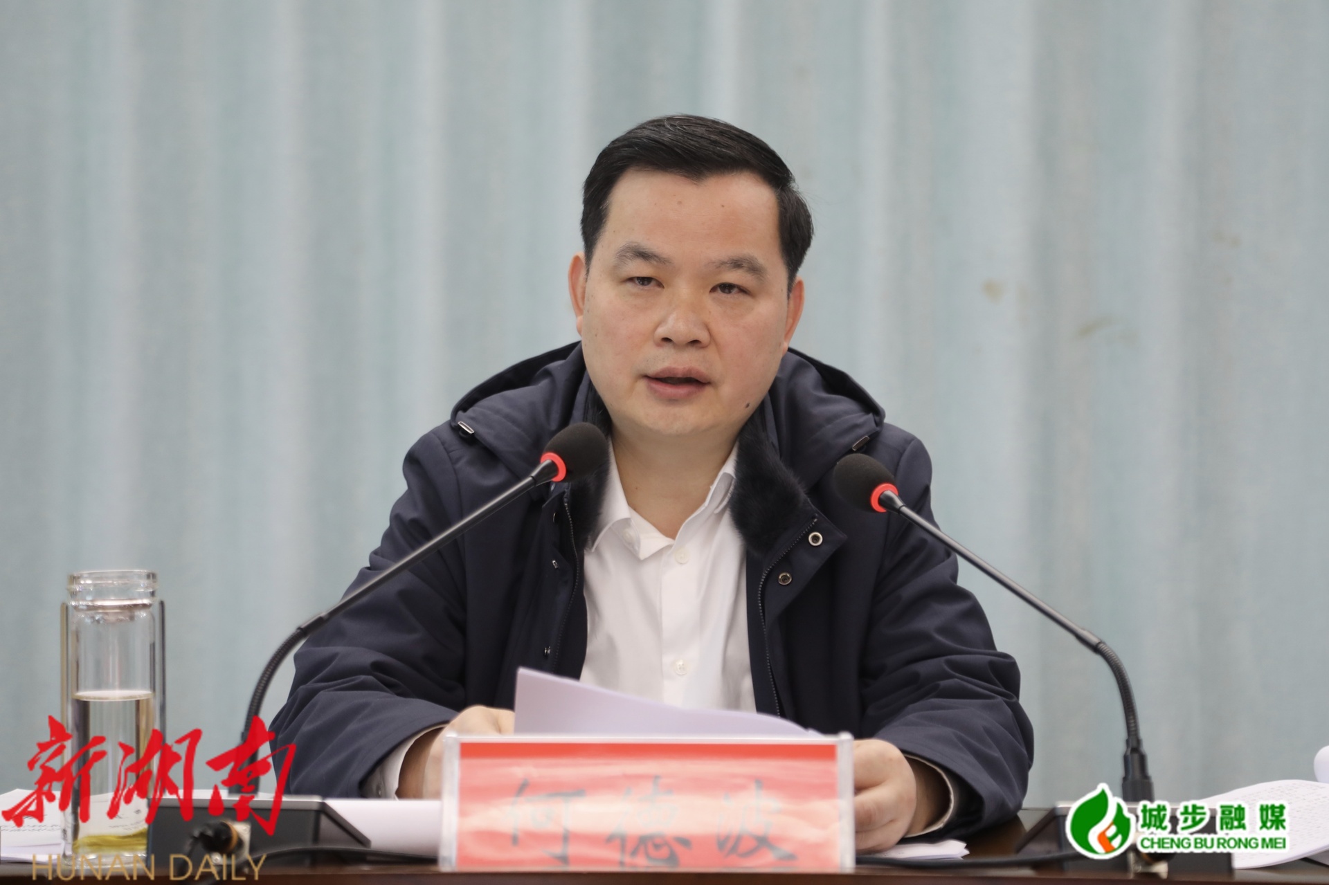图为县委书记何德波在会上讲话