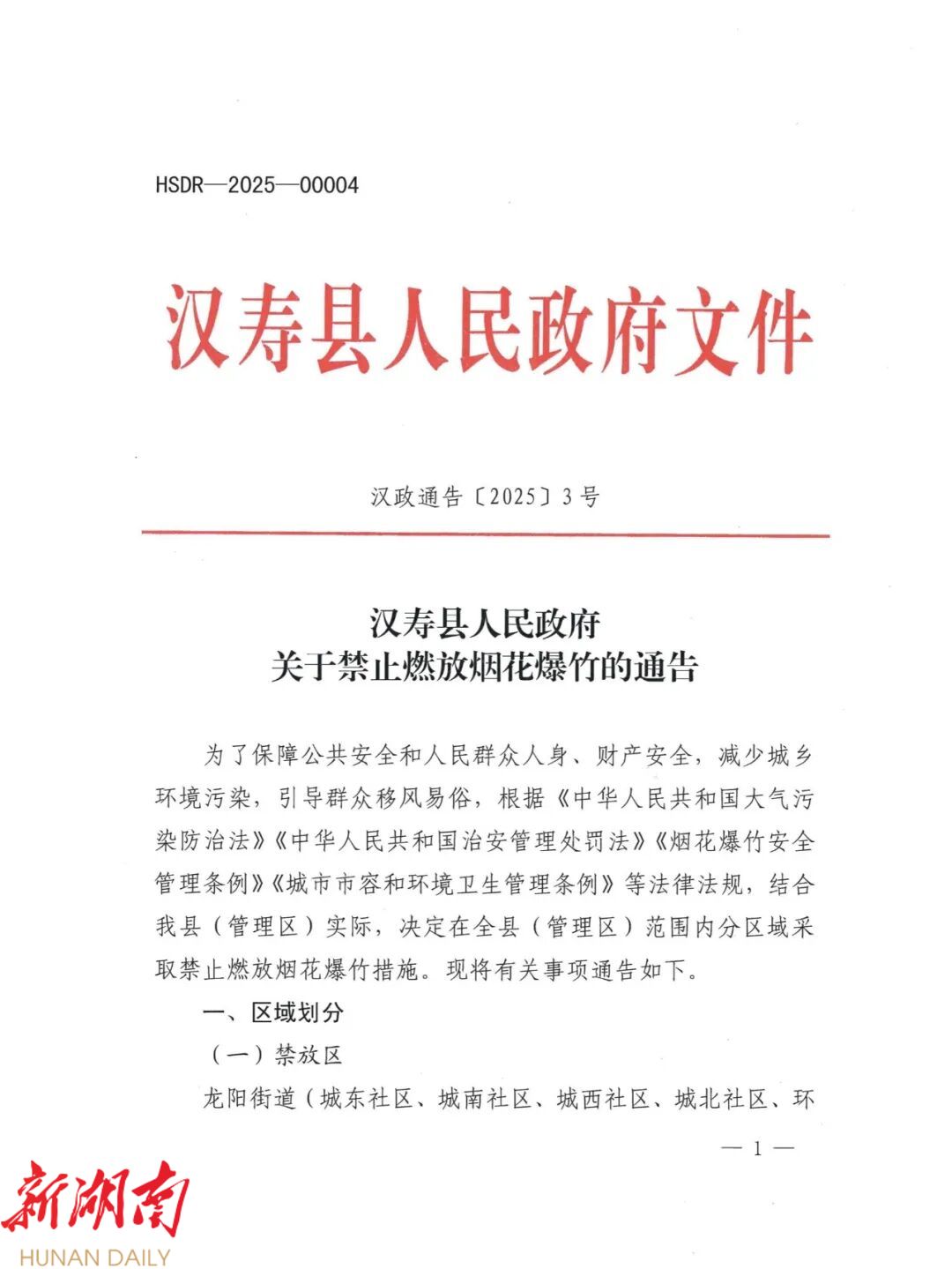 汉寿县人民政府关于禁止燃放烟花爆竹的通告