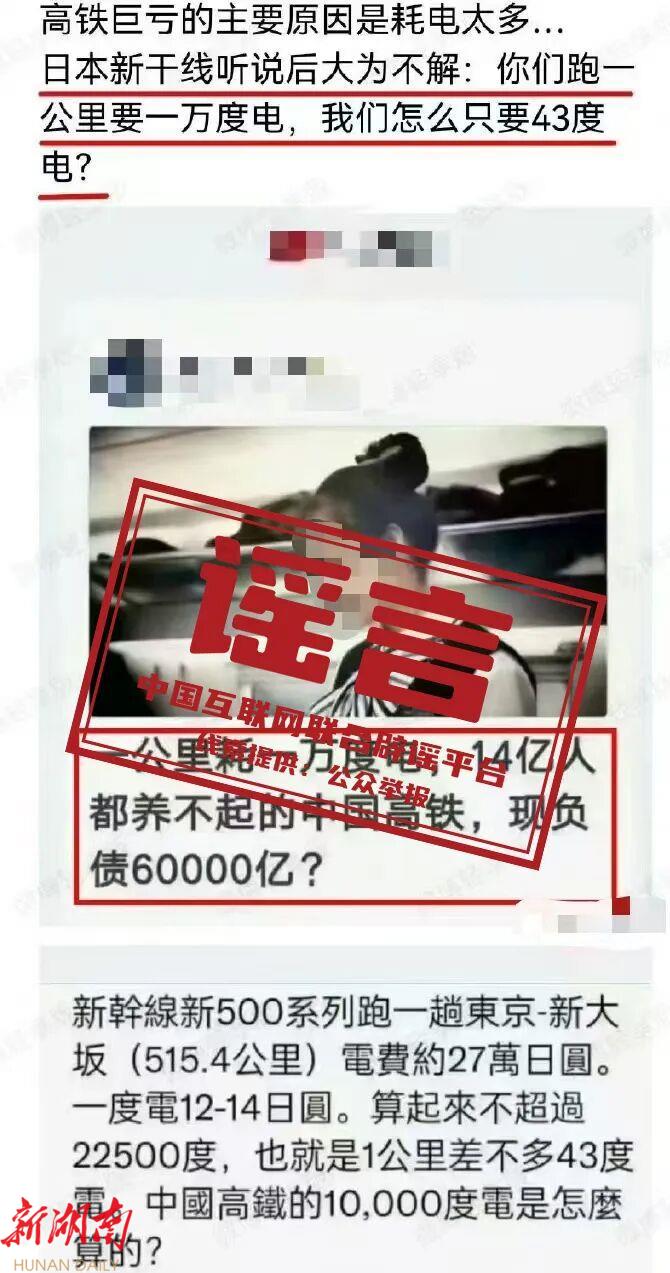 对此,中国铁道科学研究院集团有限公司机车车辆研究所表示,该说法与事实不符 。我国高铁现有四个主力车型,根据其在京沪高铁(往返距离2636公里)达速350km/h运行条件下的能耗测试数据显示,其耗电量分别为:56931度、61861度、51364度、55490度,据此推算出平均每公里耗电量分别为:21.6度、23.5度、19.5度、21.1度。由此可见,网传“一公里耗一万度电”,其实是将高铁动车组按轮周功率计算得出的每小时耗电量,错误当成每公里耗电量,偷换了单位时间与单位里程的概念。 此外,网传“日本新干线比中国高铁能耗低”这一说法亦毫无根据,与事实不符。中国高铁列车与日本新干线动车组平均每公里能耗相当。