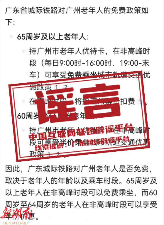 真相: 2024年5月,一张《广东省城际铁路对广州老年人的免费政策》截图在社交网络流传,其内容显示“广州老年人持优待卡在非高峰期搭广东城际可享受半价或免费优惠”,引发关注。