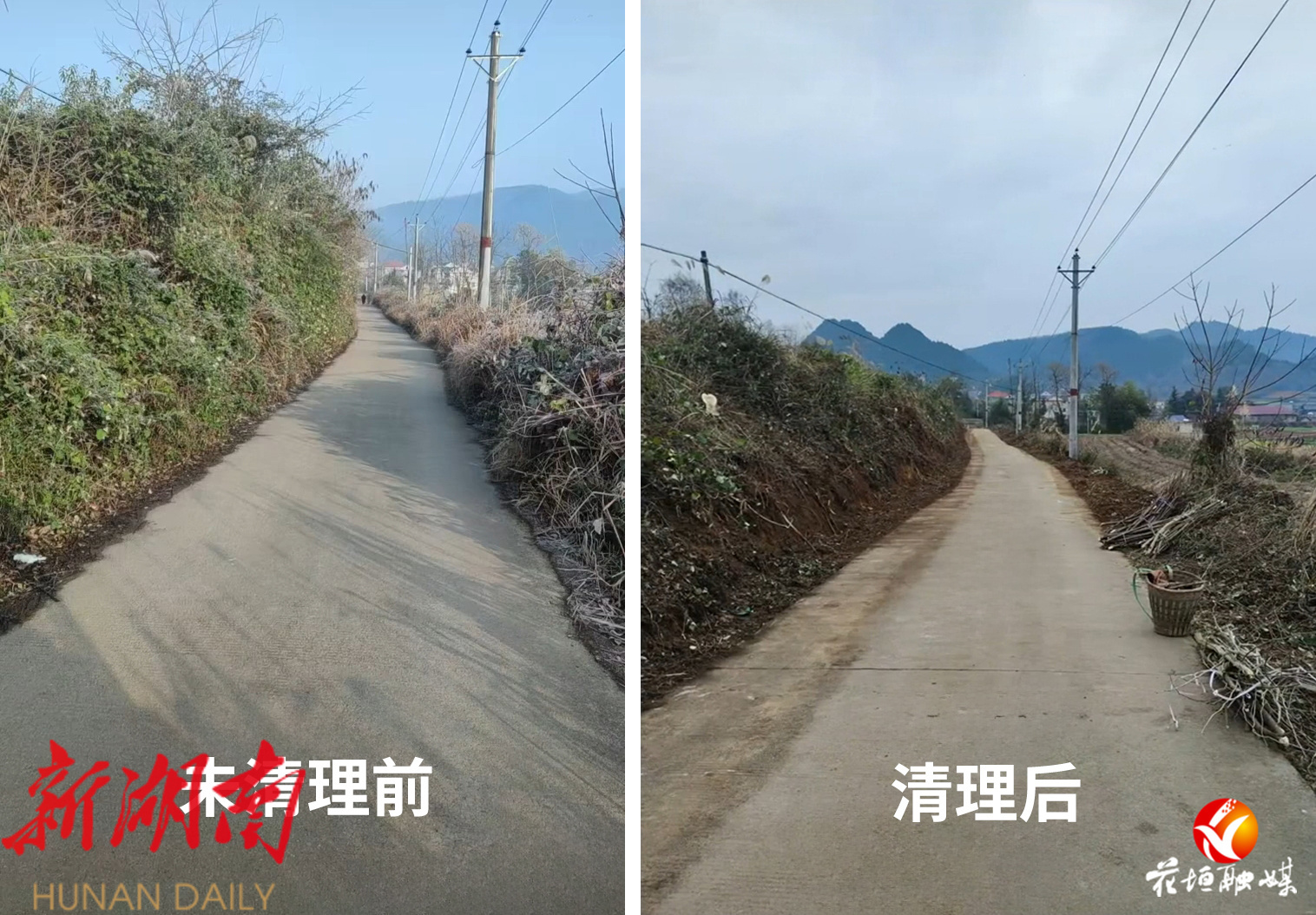 没有动员会,没有分工表,大家凭着默契各司其职——年轻人挥刀斩除顽强的藤蔓,老人细心清理盘结的枯草,孩子们也跟着搬运散落的枝条。连日的清理虽因天气原因暂停,但1月28日,队伍又聚了起来,直到村道两旁多年沉积的泥土被铲平,蔓延的植被被规整,路面重现开阔。