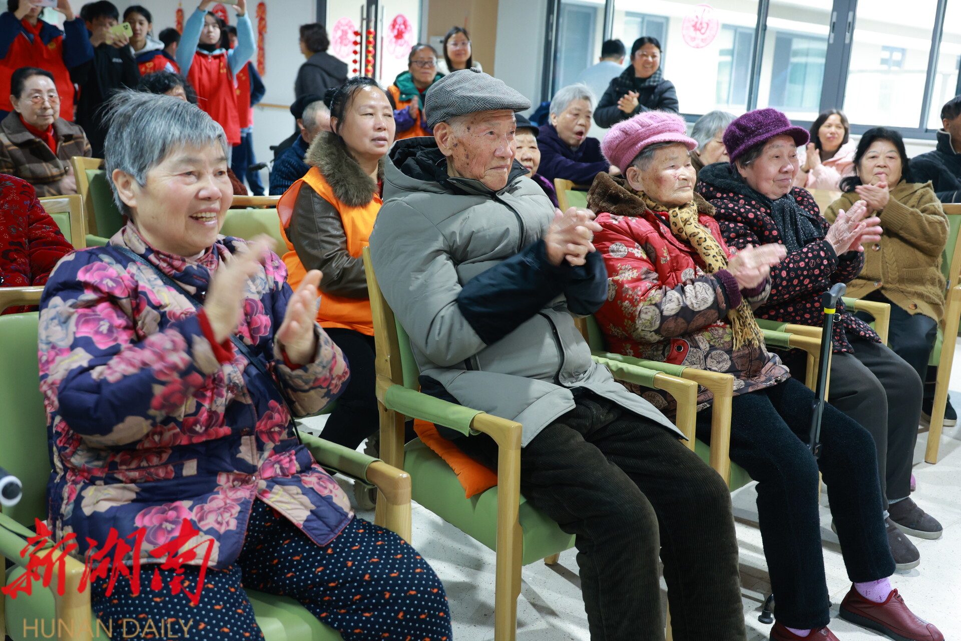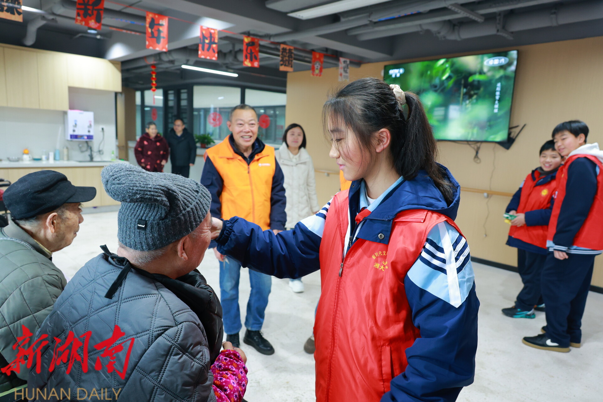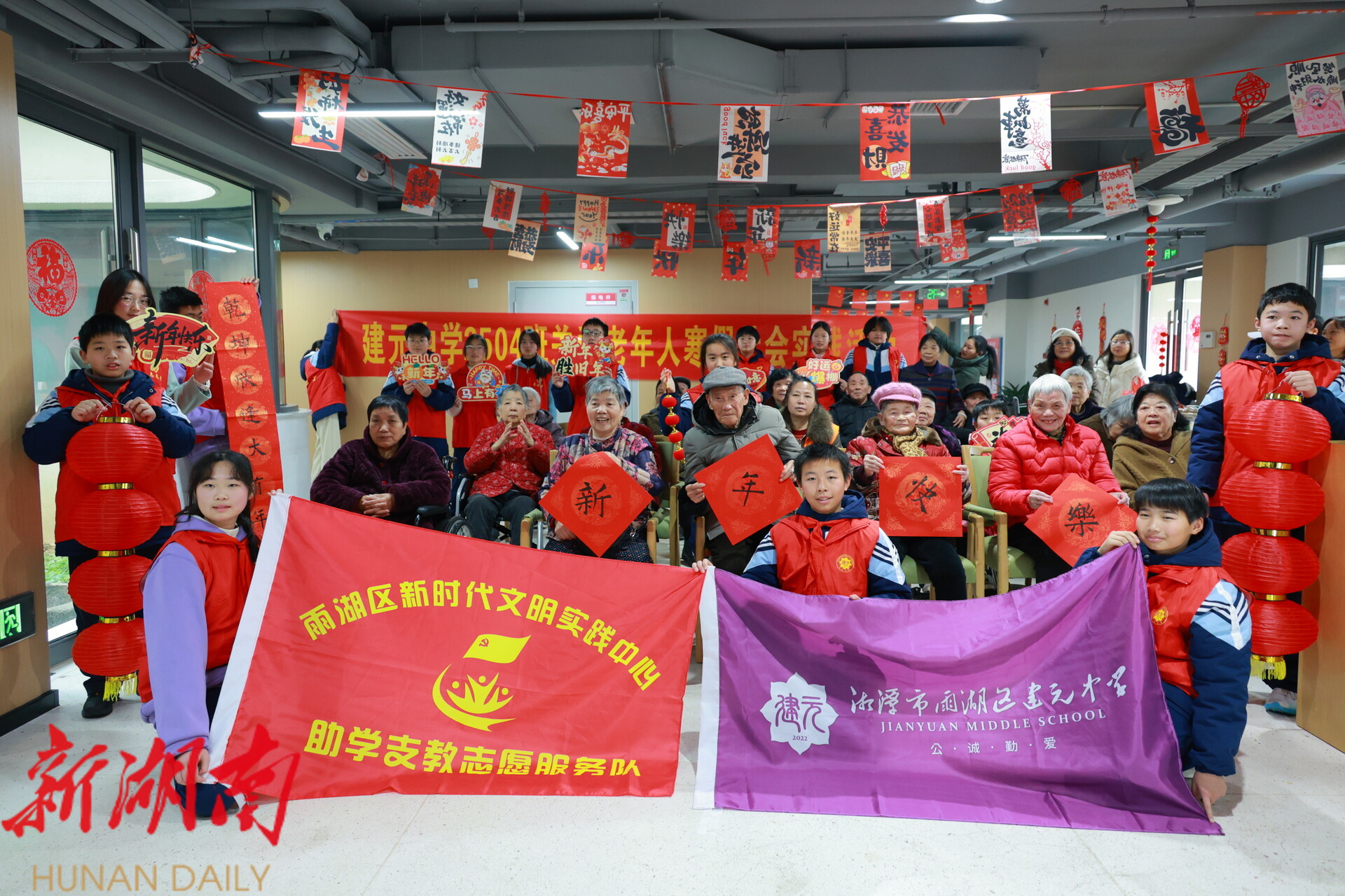 雨湖融媒1月31日讯 (记者 陈娟 肖泽全) 岁末天寒,爱心暖冬。1月31日是2026年雨湖区中学寒假首日,当天,雨湖区建元中学2504班学生志愿者团队怀揣热忱与敬意,走进晨辉怡居养老院,以才艺表演、温情陪伴、慰问献礼的方式,为院内老人们送去浓浓的新春祝福,用青春行动诠释尊老敬老的传统美德,让这个冬日的养老院暖意融融。