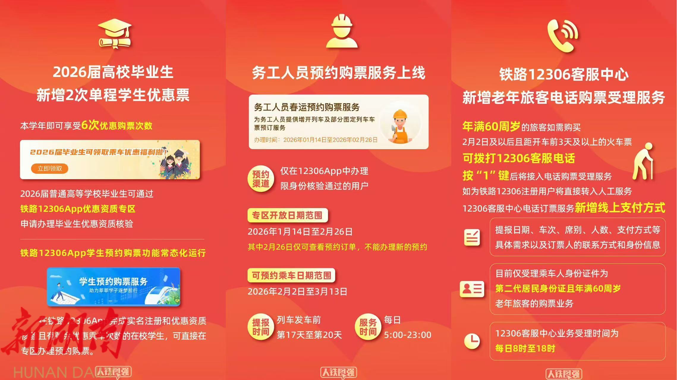 为2026届高校毕业生异地求职增加2次优惠购票次数,继续为学生、务工人员提供预约购票服务。铁路12306客服中心新增60周岁及以上老年人电话购票受理服务。