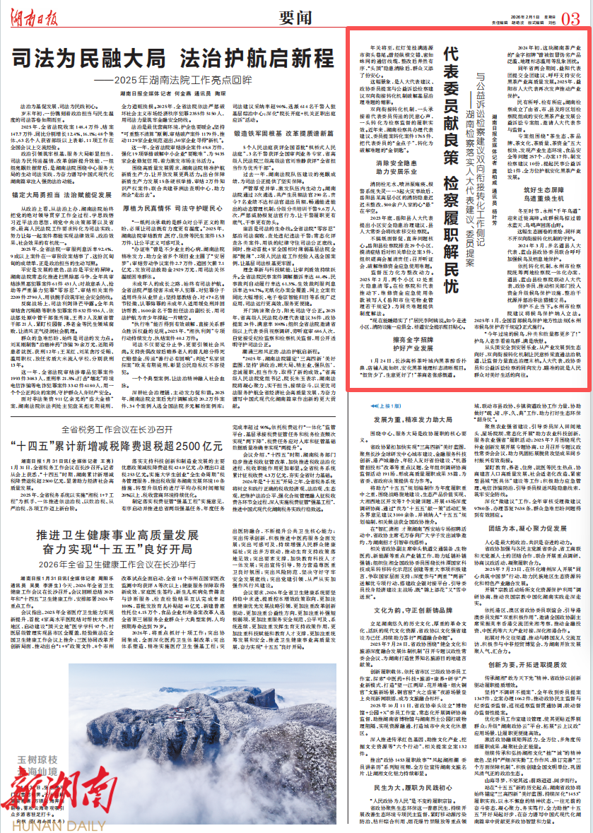 双向衔接转化机制,一头承接着代表委员传递的民意心声,一头转化为检察监督的履职实效。近年来,湖南检察共办理代表建议、委员提案转化案件1765件,把代表委员的“金点子”,转化为破解难题的“金钥匙”。