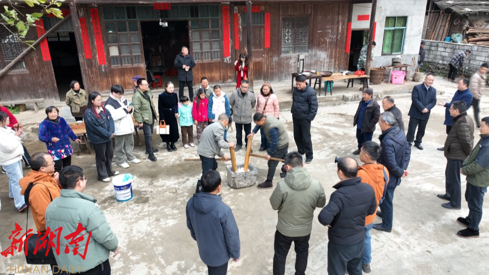 “一捶一揉皆是年,一口糍粑念乡愁。”在万里村,打糍粑的热闹场景拉开了迎新序幕。村民们提前备好优质糯米,经浸泡、蒸煮后,软糯的糯米被倒入石臼中。县融媒体中心驻桐山乡万里村工作队和青壮年村民轮番抡起木锤,奋力捶打,阵阵米香飘散四方。