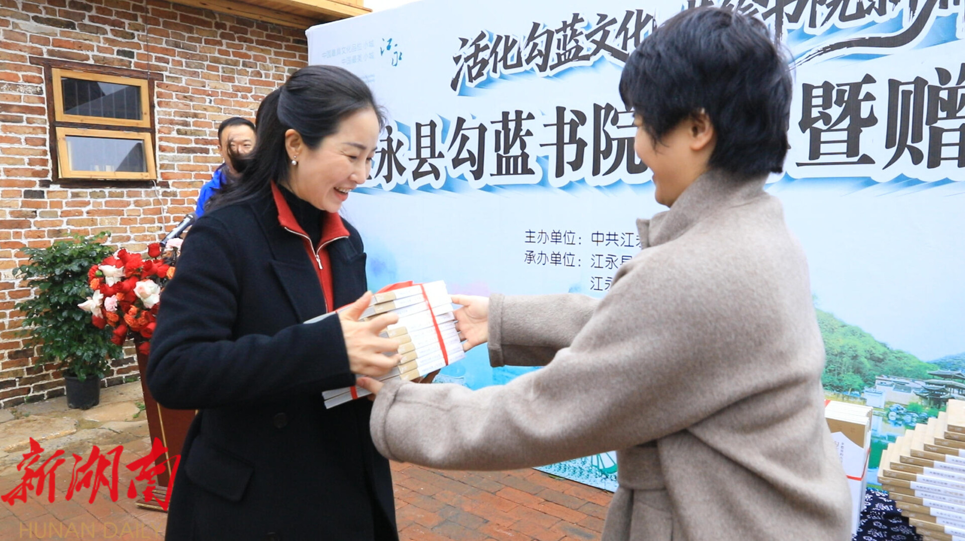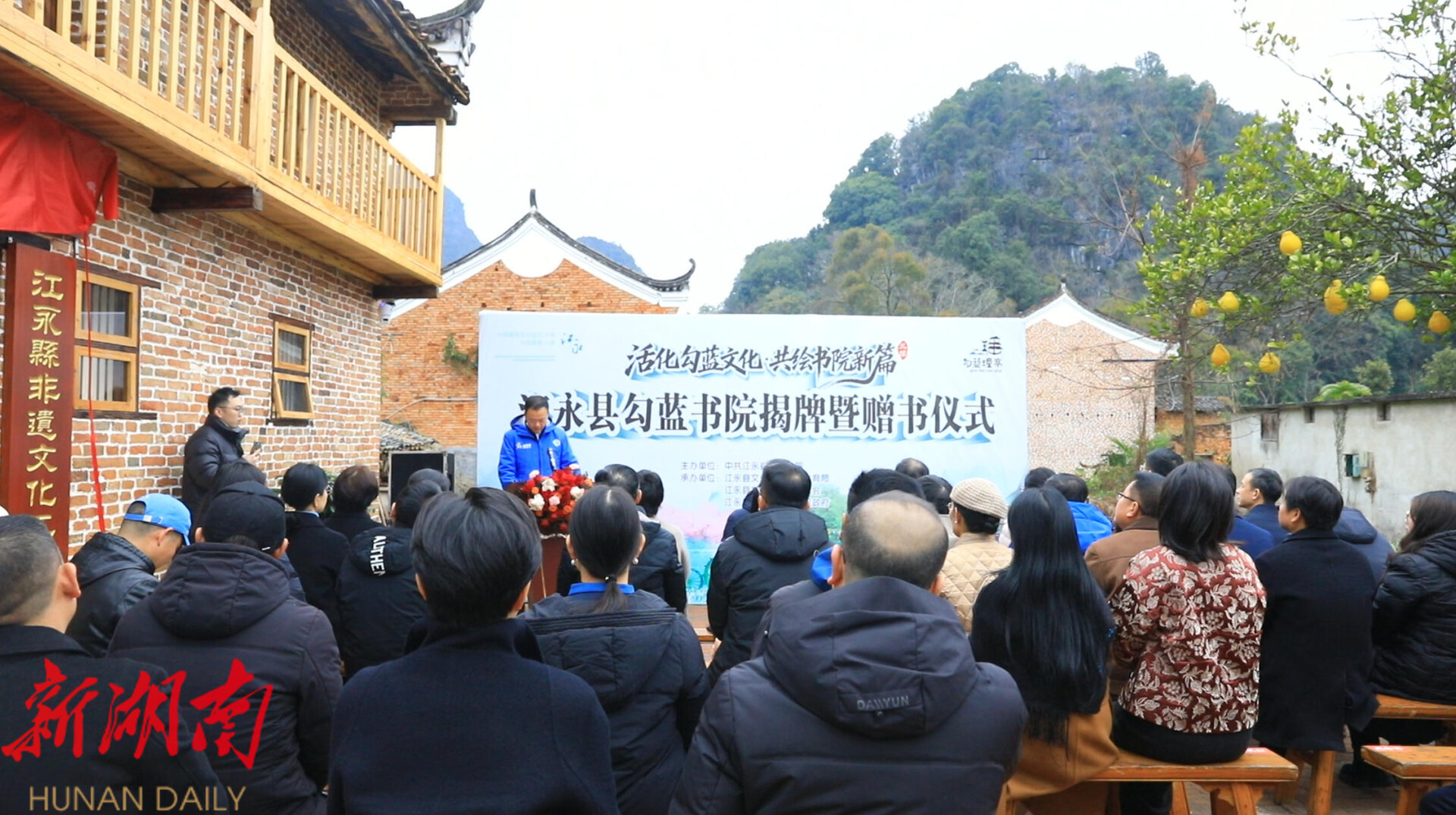 仪式由江永县委副书记、县长于思洋主持。现场,刘灿姣教授分享勾蓝瑶文化的独特价值与传承经验,她指出,勾蓝瑶寨深厚的文化积淀是江永乃至湖南的宝贵财富,勾蓝书院的落成,为乡土文化活态传承搭建了重要平台。随后,刘灿姣教授向勾蓝书院捐赠《乡愁里的古村落:勾蓝瑶寨》一书,参会领导为捐赠书籍、书画和摄影、非遗文创产品的作者颁发收藏证书,致敬文化传承者的无私奉献。