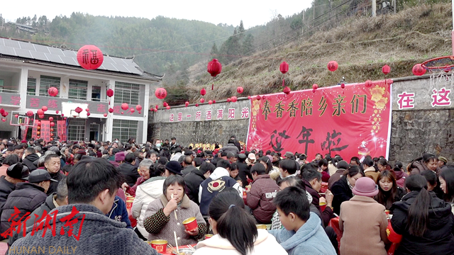 湖南日报·新湖南客户端2月2日讯(通讯员杨尚勤)2月1日,新化县奉家镇百茶源村报木片外出打拼的奉香香夫妇设宴邀请村民一起过年。