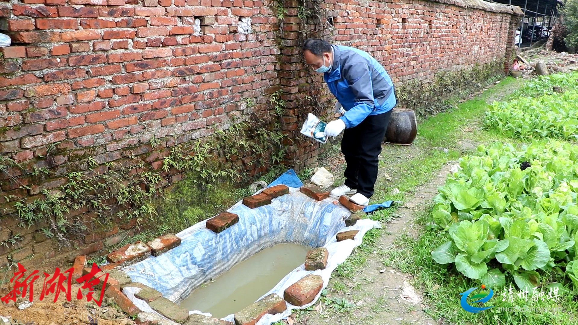 工作人员在积水处投放灭蚊颗粒剂(夏源懋 摄)