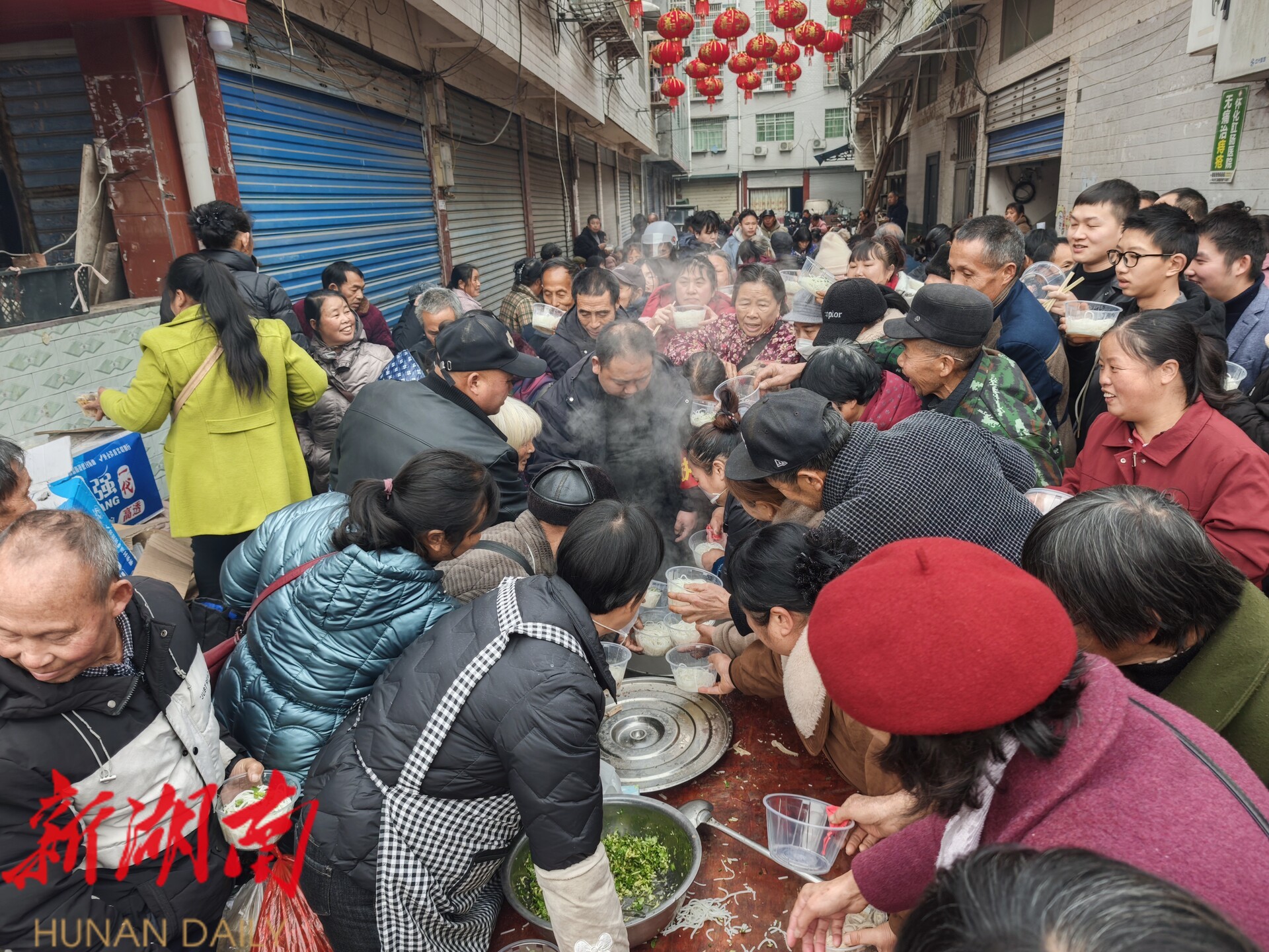 沿街的年货展位依次排开,百余米长的街区被浓郁乡味填满。农贸市场入口处,牛刨汤宴摊位前围得熙熙攘攘,成了现场的“人气担当”,大锅里,牛骨汤底咕嘟咕嘟翻滚,食客们排队等候美味,鲜醇的滋味引得众人连连称道;一旁的油豆腐摊前,江坪油豆腐在油锅中翻滚、滋滋作响,金黄油亮的豆腐块沥去多余油脂,豆香混着油香引得食客络绎不绝;活水糍粑摊位边,热气蒸腾的白糍糯被反复捶打,糯香在木锤起落间丝丝漫开,老人孩子在一旁围观、不时品尝。来自猪血丸子、腊肉的浓郁咸香扑鼻而来,村民们提着购物袋穿梭其间,你一斤我两袋,讨价还价声此起彼伏。