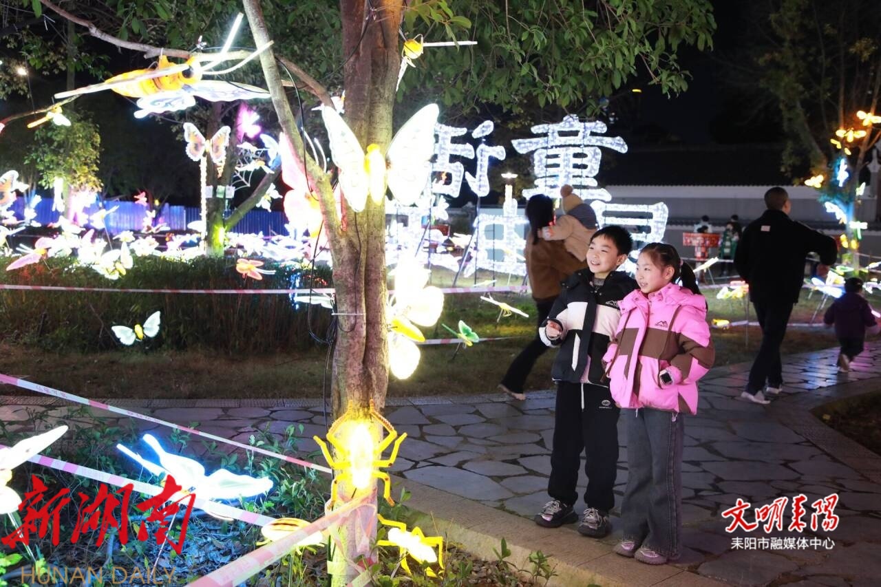 除了沉浸式光影氛围,现场的国潮演艺同样吸睛。汉服游园、川剧变脸、书法表演、国潮歌舞轮番上演,传统技艺与潮流演绎碰撞,精彩的节目引得现场掌声不断。园区内昆虫主题光影区造型别致,五光十色的蝴蝶、蚂蚁灯组栩栩如生,深受小朋友喜爱,成为孩子们的欢乐天地。