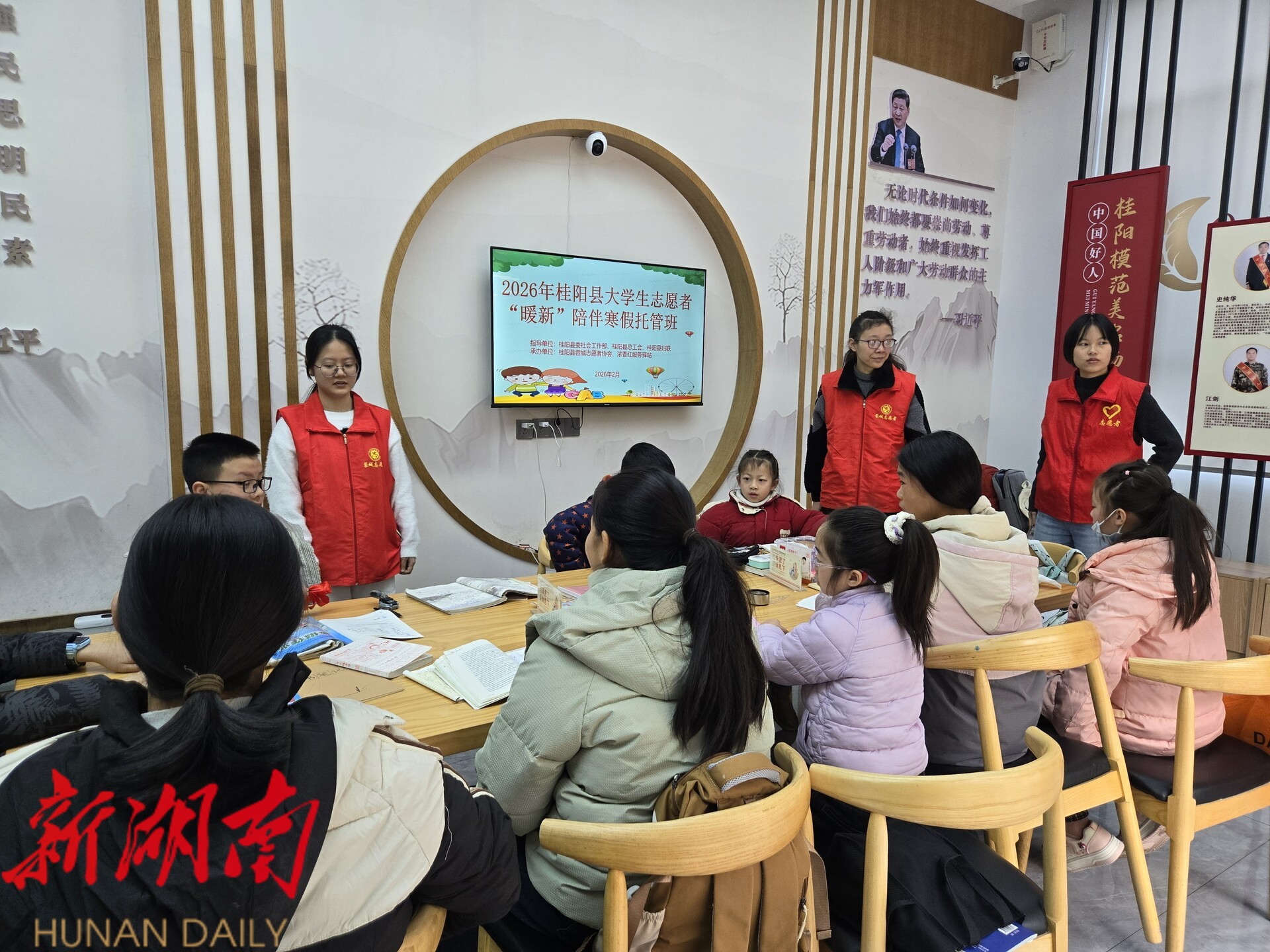 新桂阳2月4日讯(记者 李子璇 欧阳宇轩) 寒假伊始,为缓解双职工、新就业群体子女假期“看护难”问题,由县委社工部、县总工会、县妇联等单位牵头举办的2026年桂阳县大学生志愿者“暖新”陪伴寒假托管班正式开班,让孩子在欢乐中收获知识,在陪伴中健康成长。