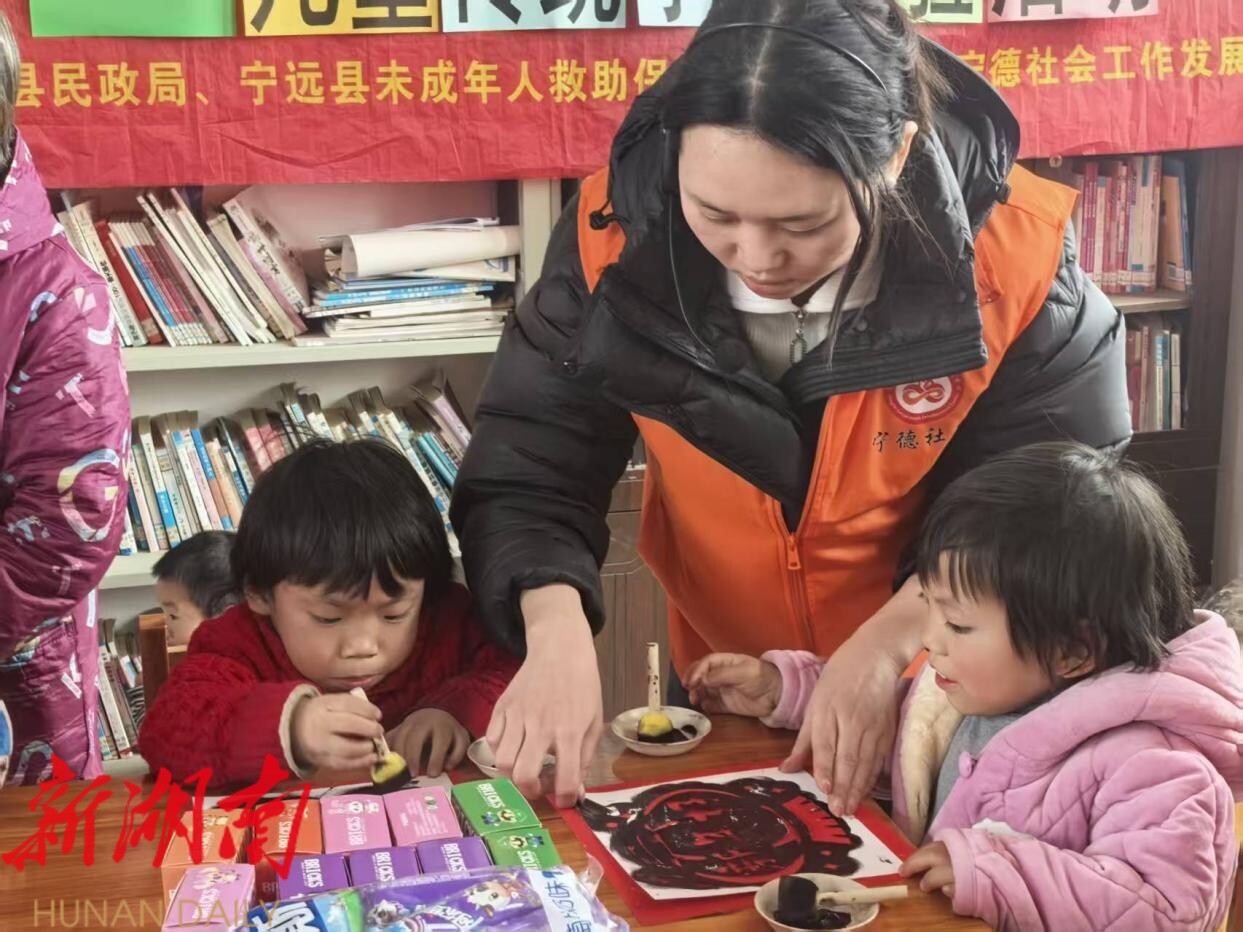 湖南日报·新湖南客户端2月4日讯(通讯员 唐文娟 ) 2月3日下午,“牵手小童心·欢乐迎新年”儿童传统手工体验活动在宁远县柏家坪镇马头上村举行。活动由宁远县民政局、县未成年人救助保护中心主办,宁远县宁德社会工作发展中心承办,该村近二十名困境儿童及留守儿童参与其中,在社工、志愿者和家长的陪伴下,体验拓印技艺,以传统方式寄托新年祈愿。