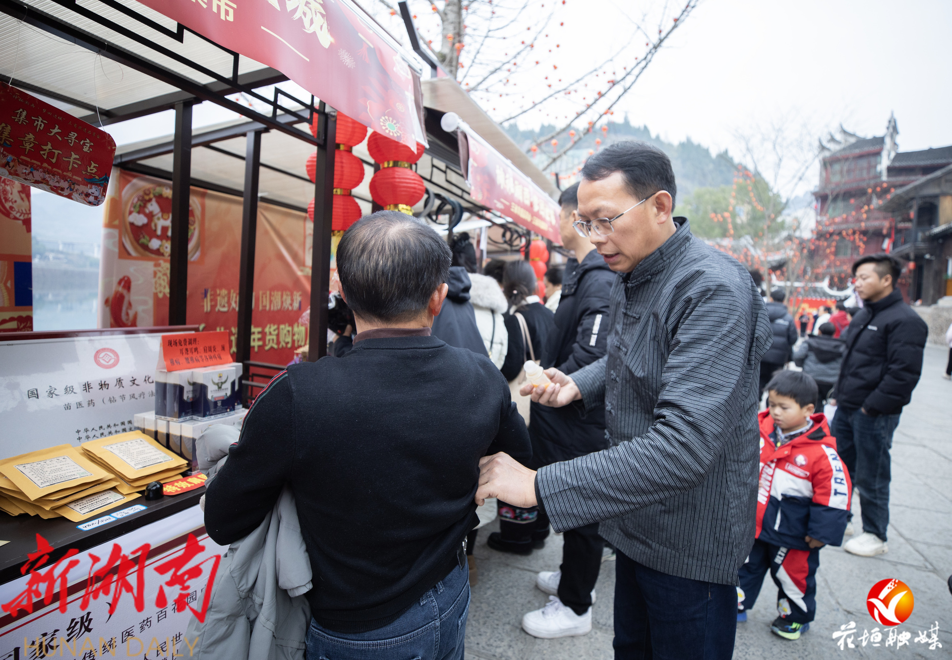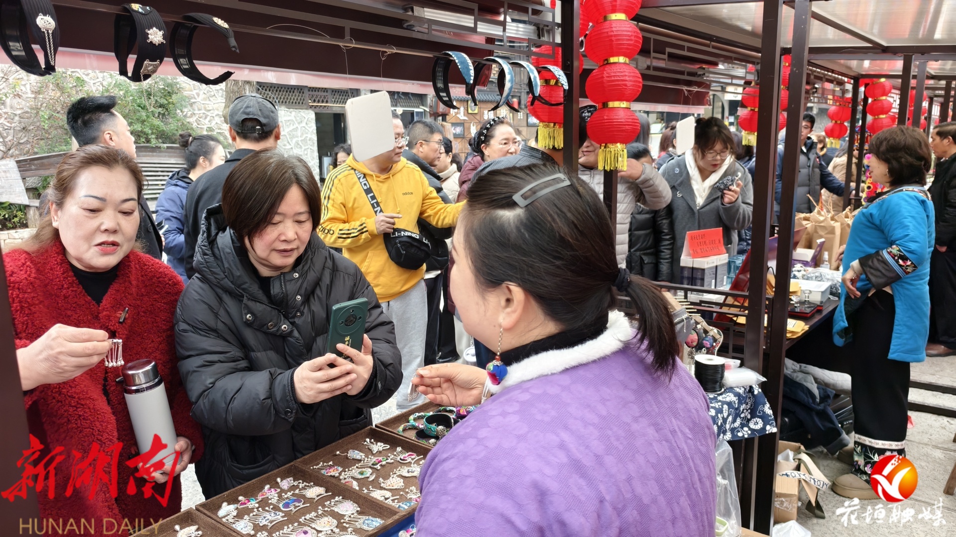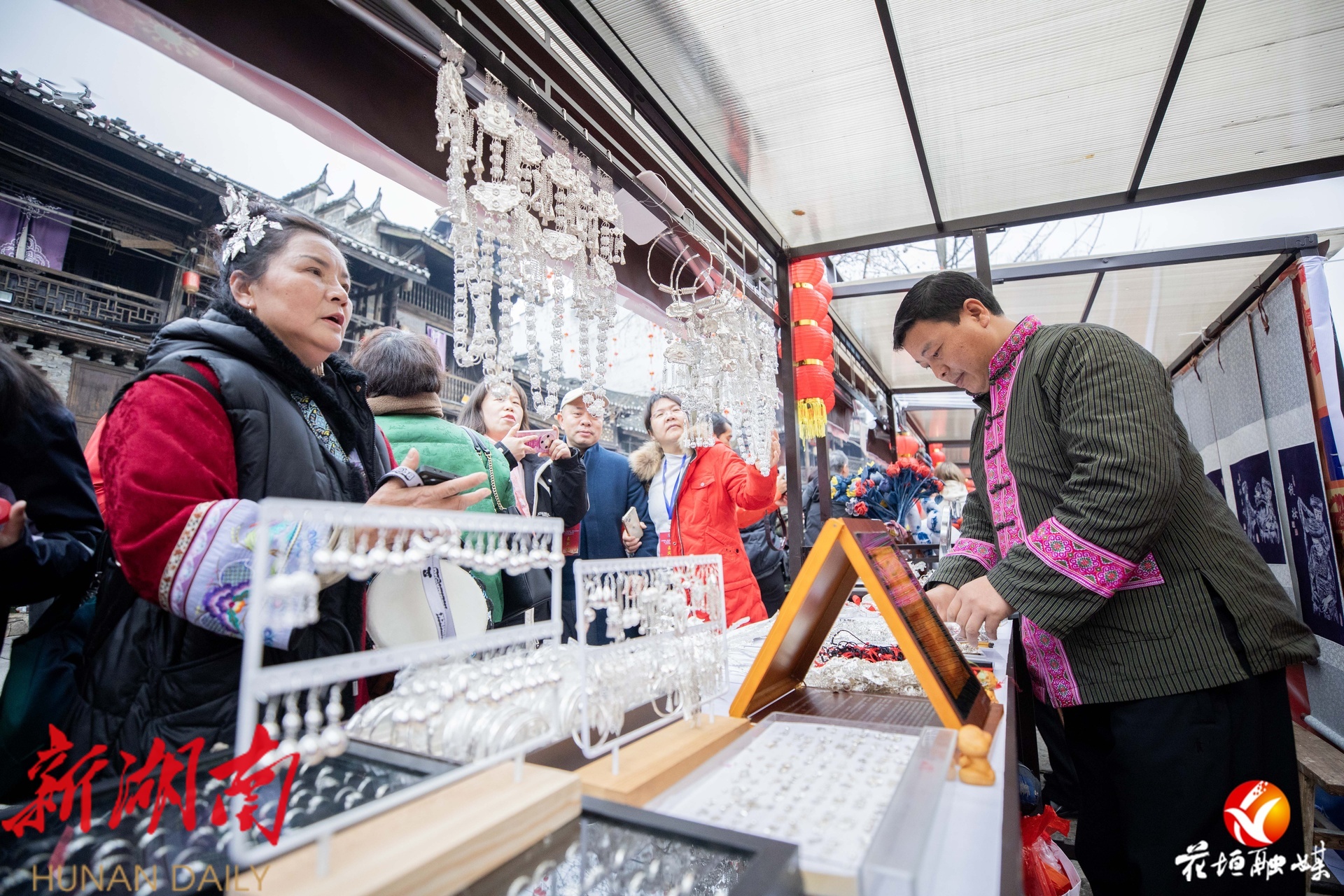 湖南日报·新湖南客户端2月5日讯(通讯员 梁金梅 肖凤)2月4日,边城茶峒江水清清,古街熙攘。一场横跨湘渝黔的“三省非遗年味集市”热闹开市。现场,吆喝声、谈笑声、银饰轻碰声此起彼伏,年味与文化味交织。