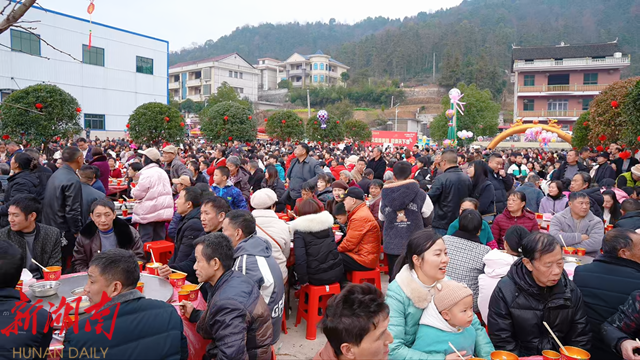 活动现场,举行了打糍粑、写春联、杀年猪等传统年俗体验活动。设置200桌宴席,近2000名受邀老人、游客等同吃黄精宴。宴席以产自示范基地的高品质新化黄精为原料,精心烹制出黄精红烧肉、黄精雪花丸子、黄精蒸鸡等特色菜肴,将地道风味与健康食材结合,香气四溢,温暖人心。