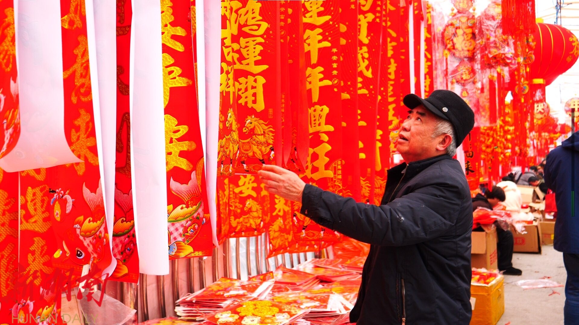 思源桥头上卖对联、福字的摊位一字排开,红彤彤的春联吸引了不少居民驻足挑选。 在对联摊位前,市民张仕仁正仔细挑选着春联,他笑着说:“今天是腊月十八,这个对联都挂出来了,家家户户熏起了腊肉,这个年味浓起来了。”随着春节的临近,备年货的市民也越来越多。“二十三以后买的人就会越来越多了。”摊主宋泽娣一边忙着招呼客人,一边说道。