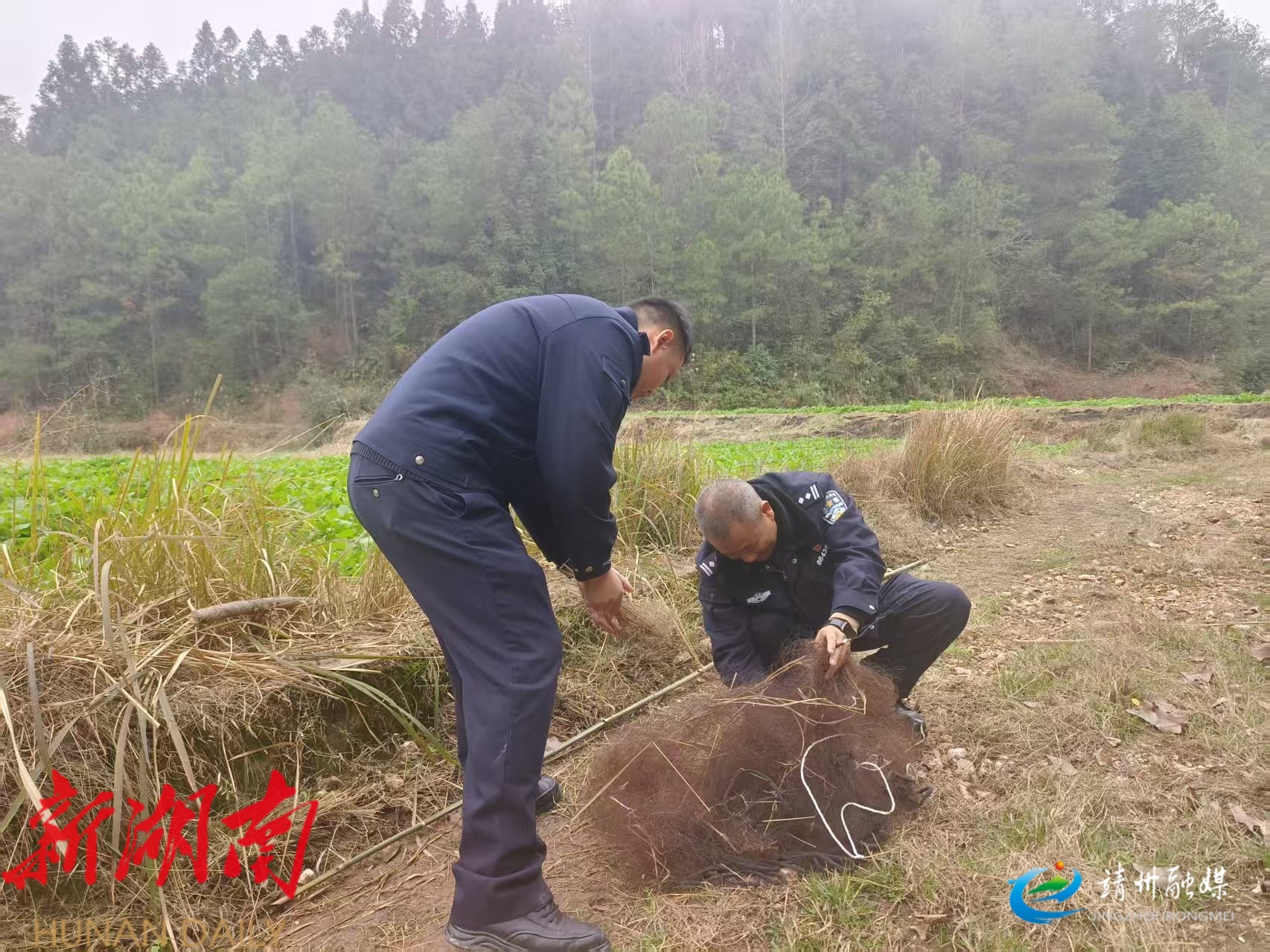 在新厂镇和平村附近农田区域,执法人员发现并拆除 2 张隐蔽设置的非法捕鸟网,现场查获的捕鸟网已造成野生鸟类伤亡。执法人员现场对涉事村民开展野生动物保护普法教育,引导其树立生态保护意识。