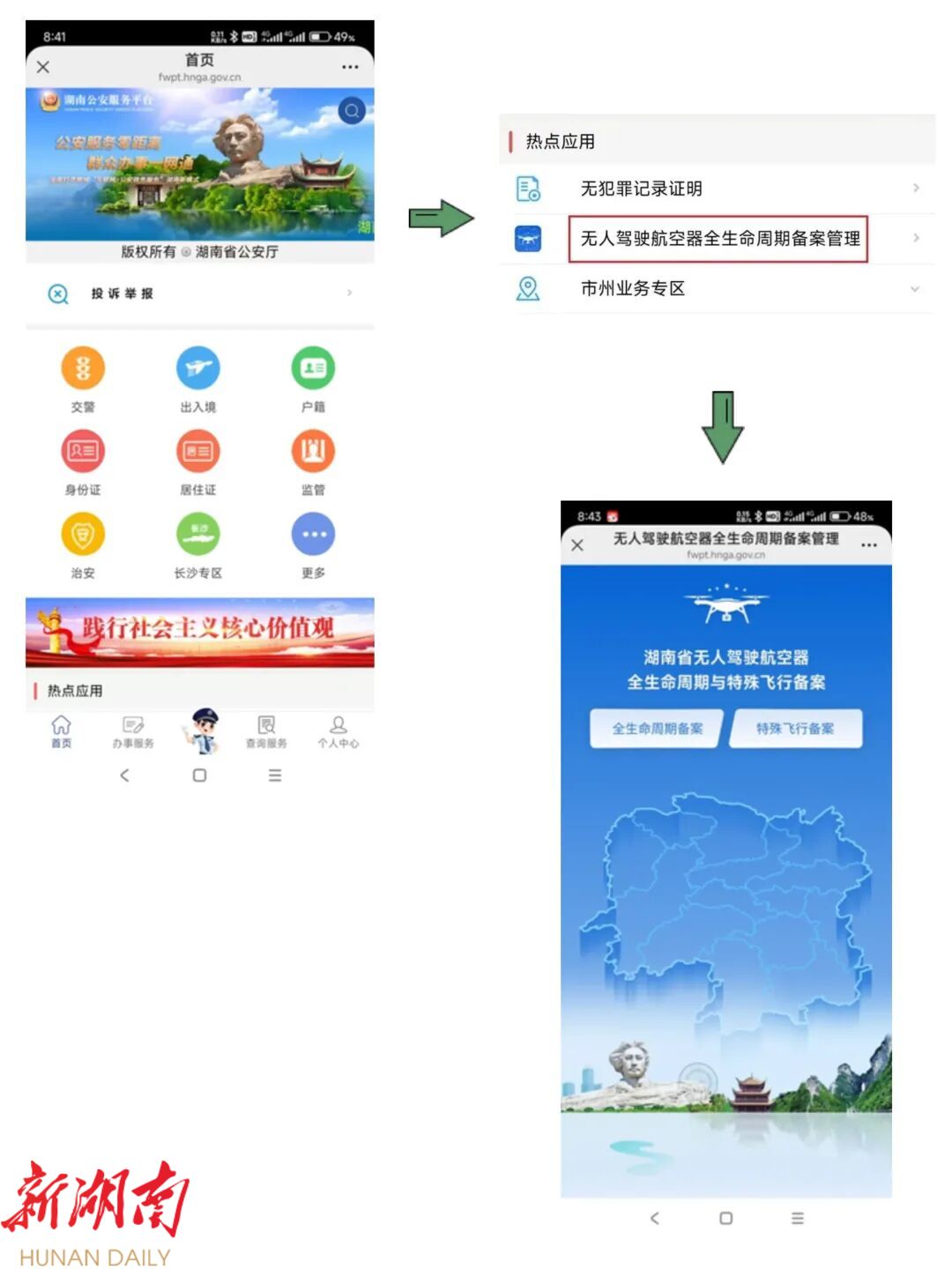 公安机关备案 :通过微信进入“ 湖南公安服务平台 ”,在“微警务”模块中选择“无人驾驶航空器全生命周期备案管理”,按指引完成信息填报与资料上传,提交审核。