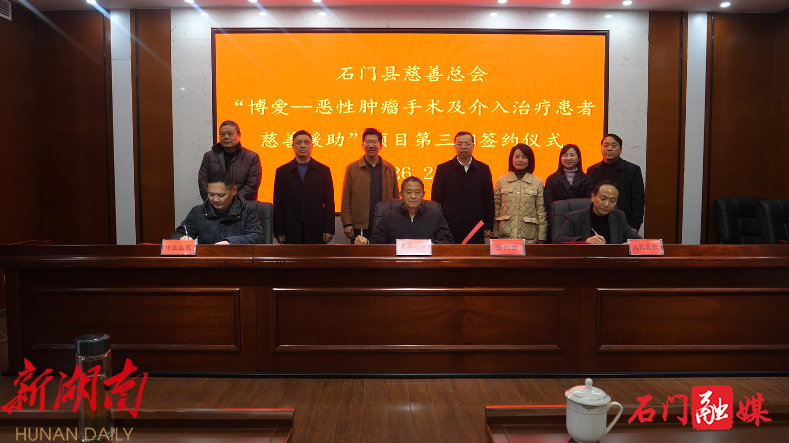 新石门客户端2月6日讯(记者 王正龙)2月4日,石门县慈善总会“博爱——恶性肿瘤手术及介入治疗患者慈善援助”项目2026年度签约仪式在县民政局举行。
