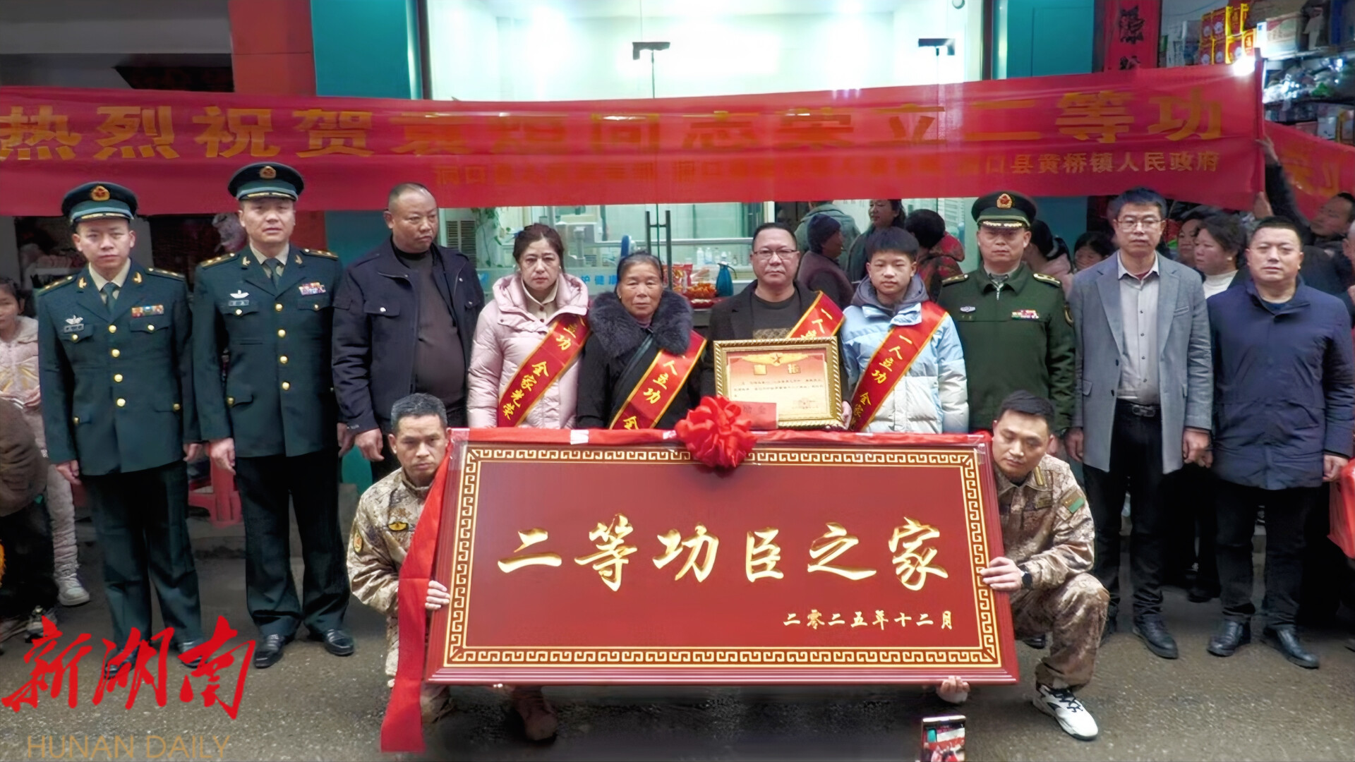 洞口融媒2月6日讯 (记者:邓贝乐 通讯员:周后明 ) 2月6日,由县人武部、县退役军人事务局联合黄桥镇政府相关负责人组成慰问组,为荣立“二等功”的现役军人袁烜家属送上喜报。