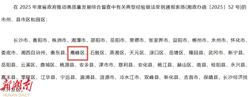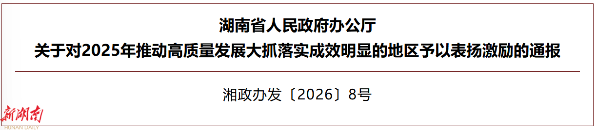 近日,湖南省人民政府办公厅发布《关于对2025年推动高质量发展大抓落实成效明显的地区予以表扬激励的通报》,对在全省推动高质量发展、大抓落实工作中成效明显的地区予以表扬激励。雁峰区在2025年推动高质量发展大抓落实工作中成效明显,推动高质量发展典型经验做法获省政府通报表扬!