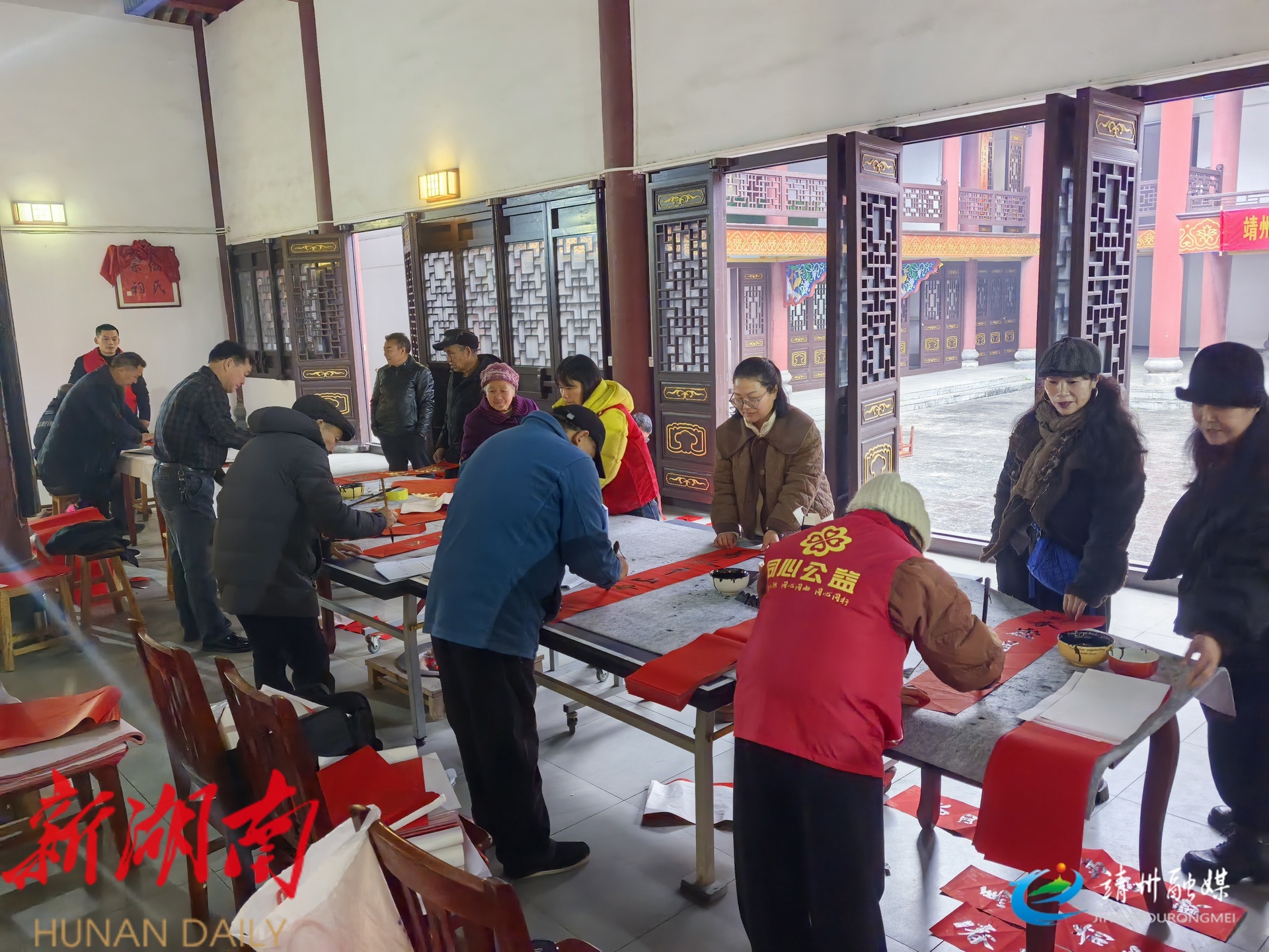 靖州融媒2月7日讯 (记者 钦苏芬 通讯员 秦明)2月7日,靖州苗族侗族自治县硬笔书法家协会走进渠阳镇三和村,开展写春联、送春联志愿服务活动。书法家们与志愿者携手同台,以笔墨为媒,为当地村民送上饱含心意的新春祝福。