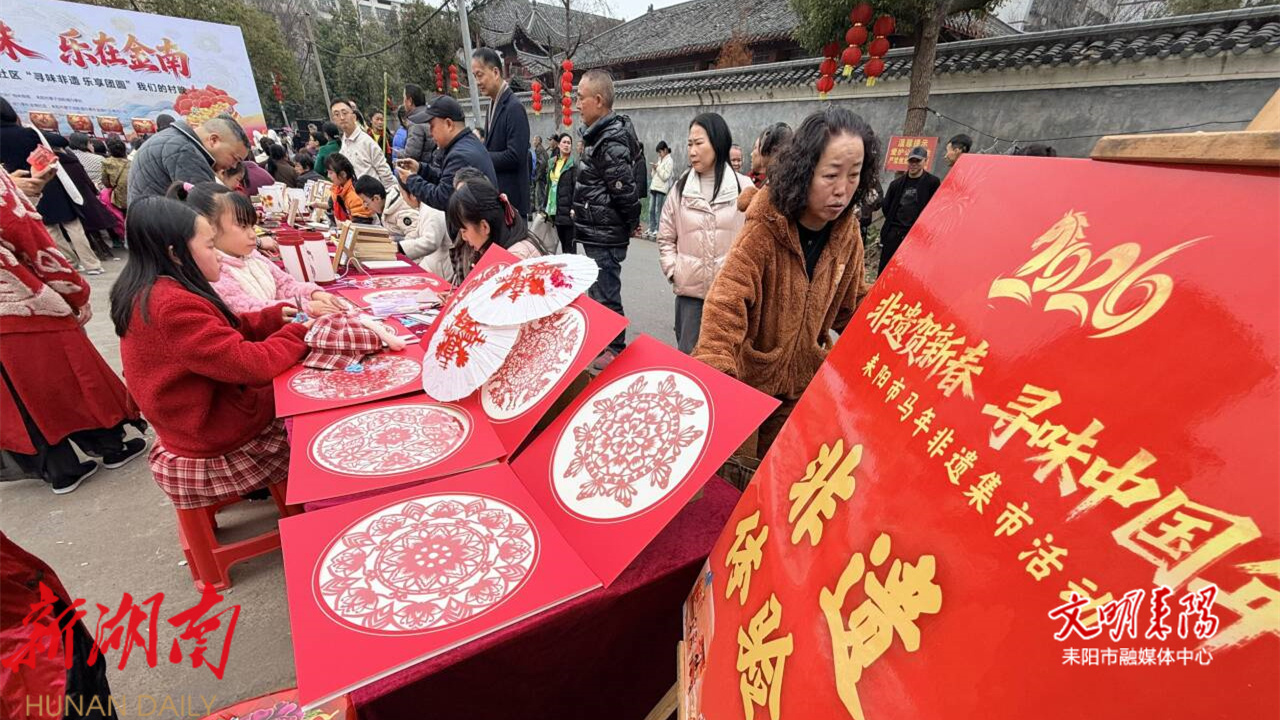 活动现场精心打造的非遗集市成为一大亮点。这里不仅汇聚了众多传统非遗项目展示与手工艺品,还设有当地特色小吃摊位,让居民在感受文化魅力的同时,也能品尝到熟悉的美味。版画拓印、活字印刷等传统非遗项目前围满了好奇的居民,大家纷纷上手体验,近距离感受古老技艺的独特魅力。竹编、剪纸等精美的手工艺品琳琅满目,引得众人纷纷驻足欣赏、拍照留念。与此同时,当地书法家们现场挥毫泼墨,免费为居民书写并赠送春联。一副副饱含新春祝福与美好愿景的春联,传递着浓浓的年味,让现场充满了温馨祥和的氛围。居民们扶老携幼,在各摊位前排起长队,现场气氛热烈非凡。金南社区居民谢佳慧高兴地说:“今天的村晚不仅文艺表演精彩,让人看得十分尽兴。而且还能体验到各种非遗,这让我们真切地感受到生活越来越好,越来越幸福了。书法家写的春联非常好,年味十足,回去我就贴在家门口!”
