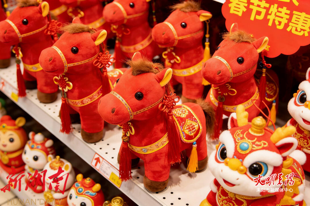 耒阳融媒2月8日讯(记者 袁成龙) 临近春节,我市消费市场一片红火。以“马”为主题的各类年货商品销售火热,成为节前消费亮点,浓厚喜庆的年味氛围洋溢在城市各处。