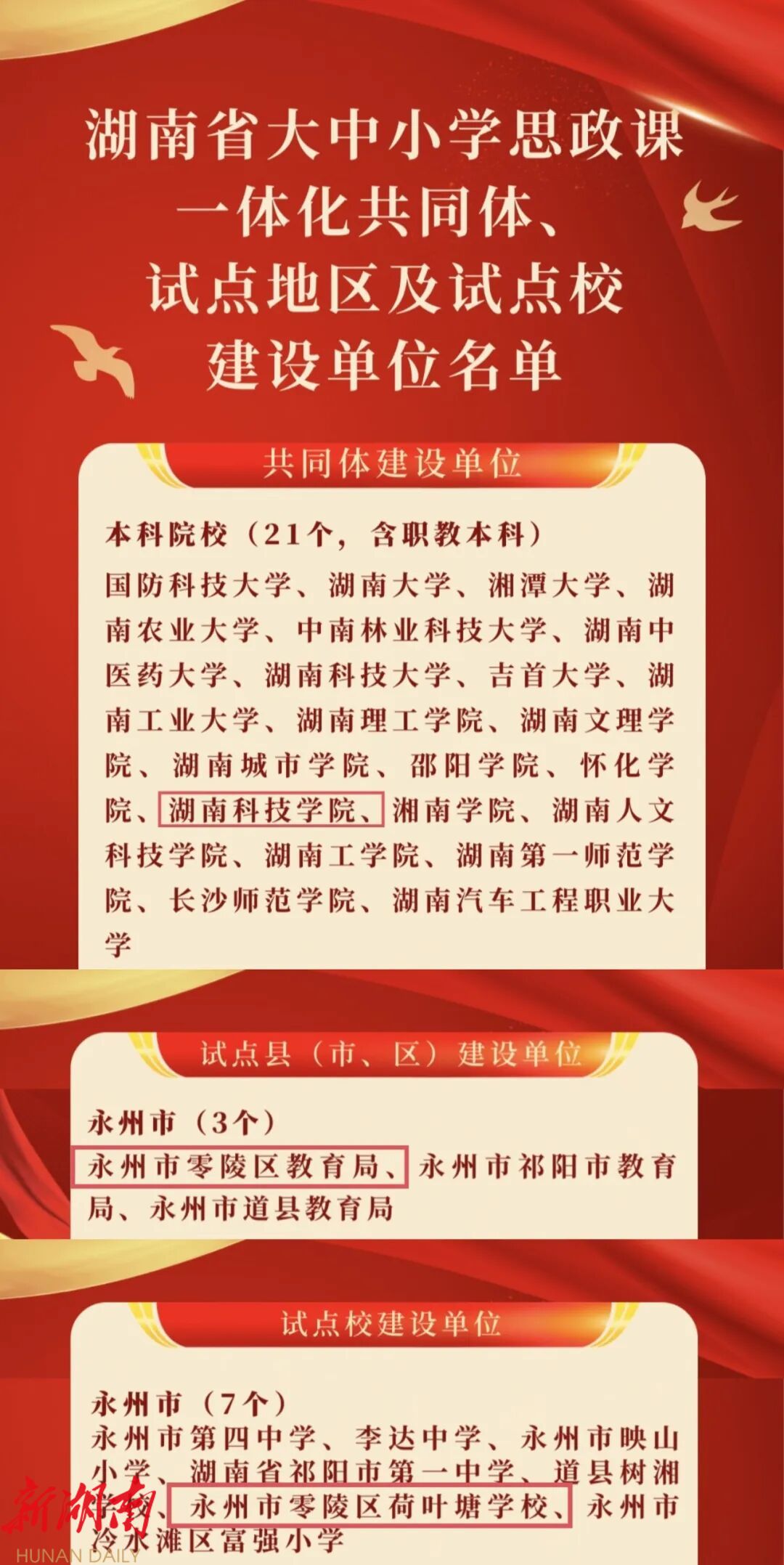 湖南日报·新湖南客户端2月9日讯(通讯员 单建华)近日,湖南省公布大中小学思政课一体化建设试点名单,一条纵向贯通、横向联动的思政育人链在全省铺开。零陵区获得多方面认可:区教育局入选21个试点县(市、区)建设单位,荷叶塘学校跻身100所试点校行列,湖南科技学院入选本科院校类一体化共同体建设单位。这标志着零陵区在大中小学思政课一体化建设中迈出系统性探索的重要一步。