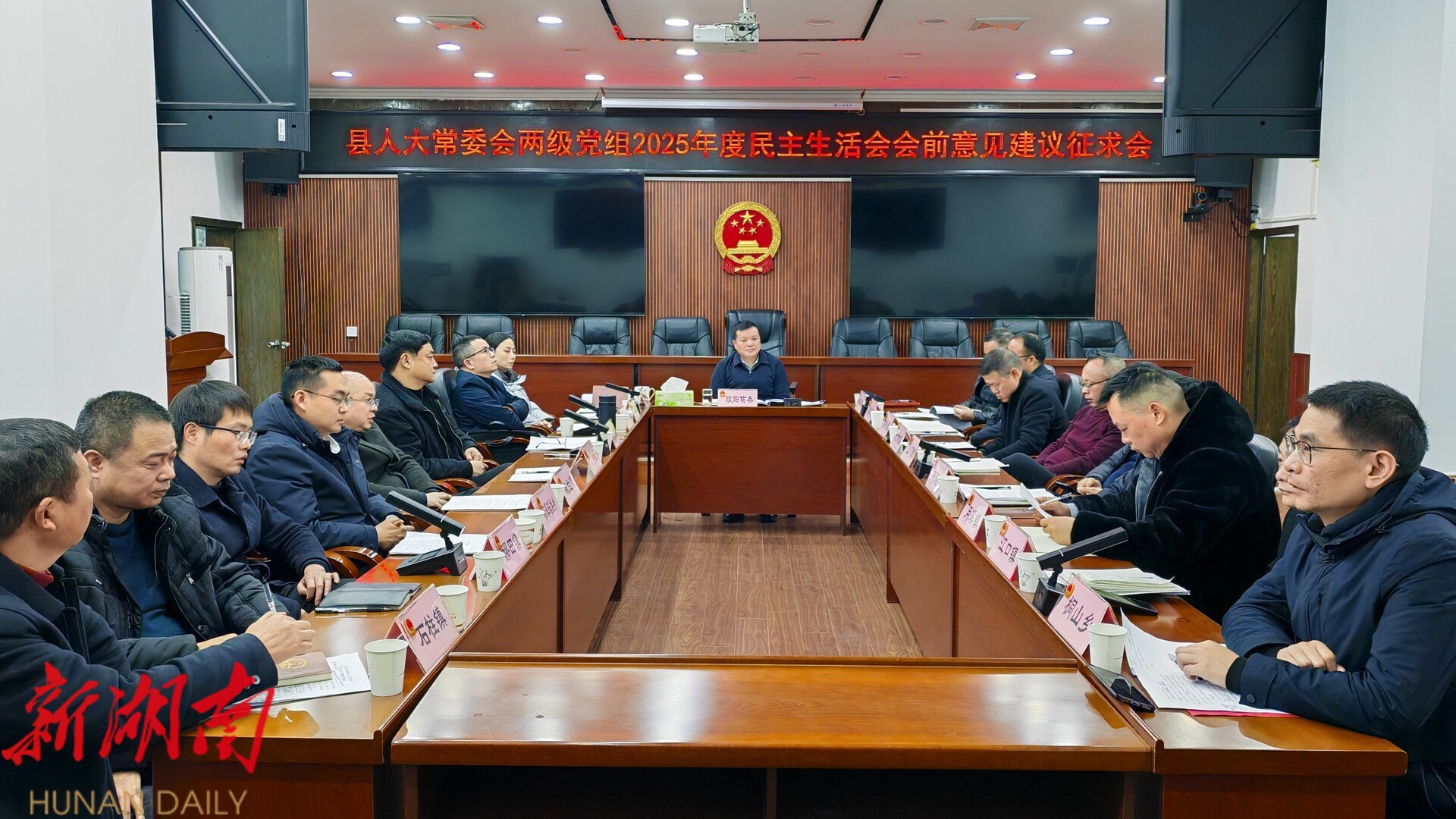 洞口融媒2月9日讯 (记者:胡涛 通讯员:曾盛) 为高质量开好2025年度县人大常委会两级党组民主生活会,2月9日,县人大常委会党组、机关党组2025年度民主生活会会前征求意见座谈会,开展以“讲政治、守规矩、勇担当、善作为”为主题的谈心谈话活动,同时谋划2026年乡镇(街道、管理区)人大工作。县人大常委会党组书记、主任欧阳佑春主持会议并讲话,全县各乡镇(街道、管理区)人大主席(联工委主任)参加会议。